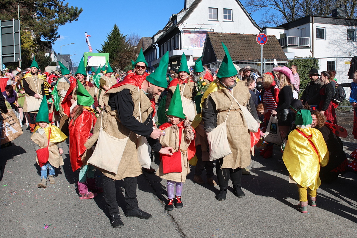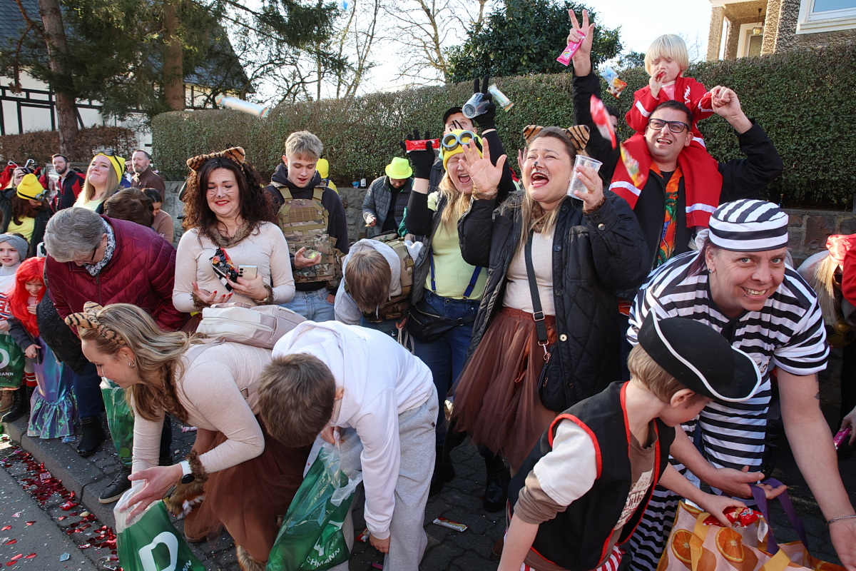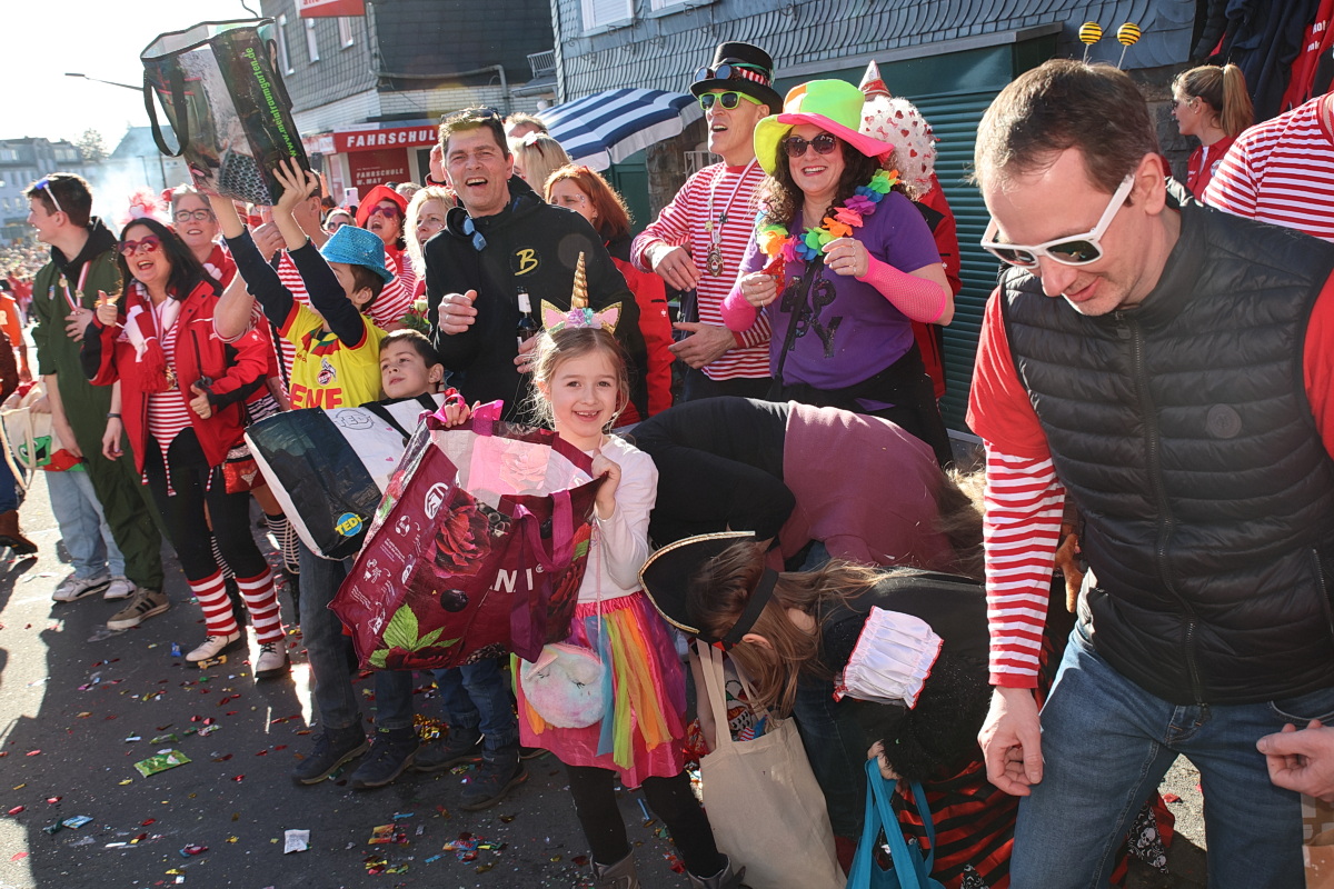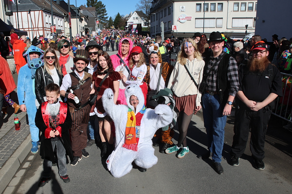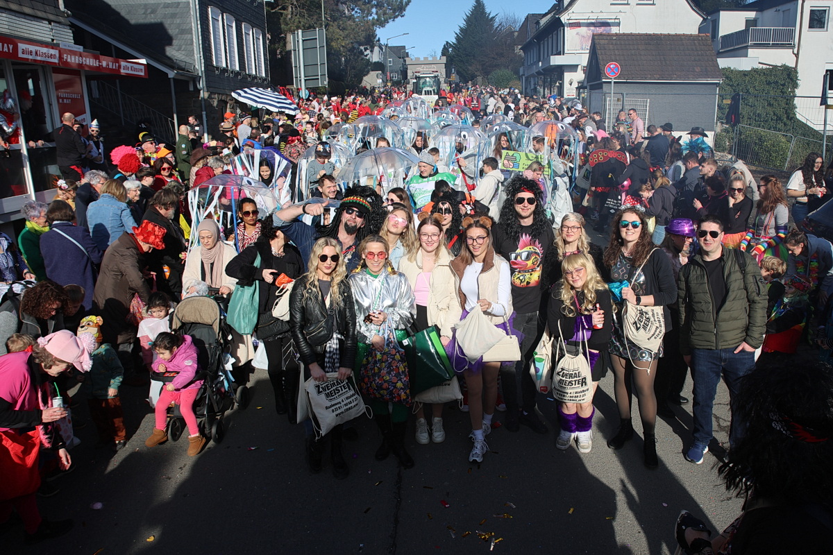 Aus der Obstschale waren freilaufende Erdbeeren, Ananasfrüchte und Bananen dabei, aus dem Mittelalter nahmen Ordensleute, Knappen und Edelleute teil, aus dem Tierpark waren Hirsche, Dinosaurier und Delfine entkommen. Zusammen mit Brausetütchen, Sonnenblumen, Zauberern und tausender bunt kostümierte Jecken bildeten sie entlang des Zugweges ein ansehnliches und eindringlich um Kamelle flehendes Zuschauerspalier, das sich ausgehend vom Bahnhof, entlang der Bahnhof-, Venn- und Talstraße bis hin zum Zugende an der Nutscheidhalle gebildet hatte.