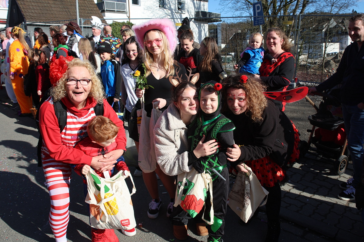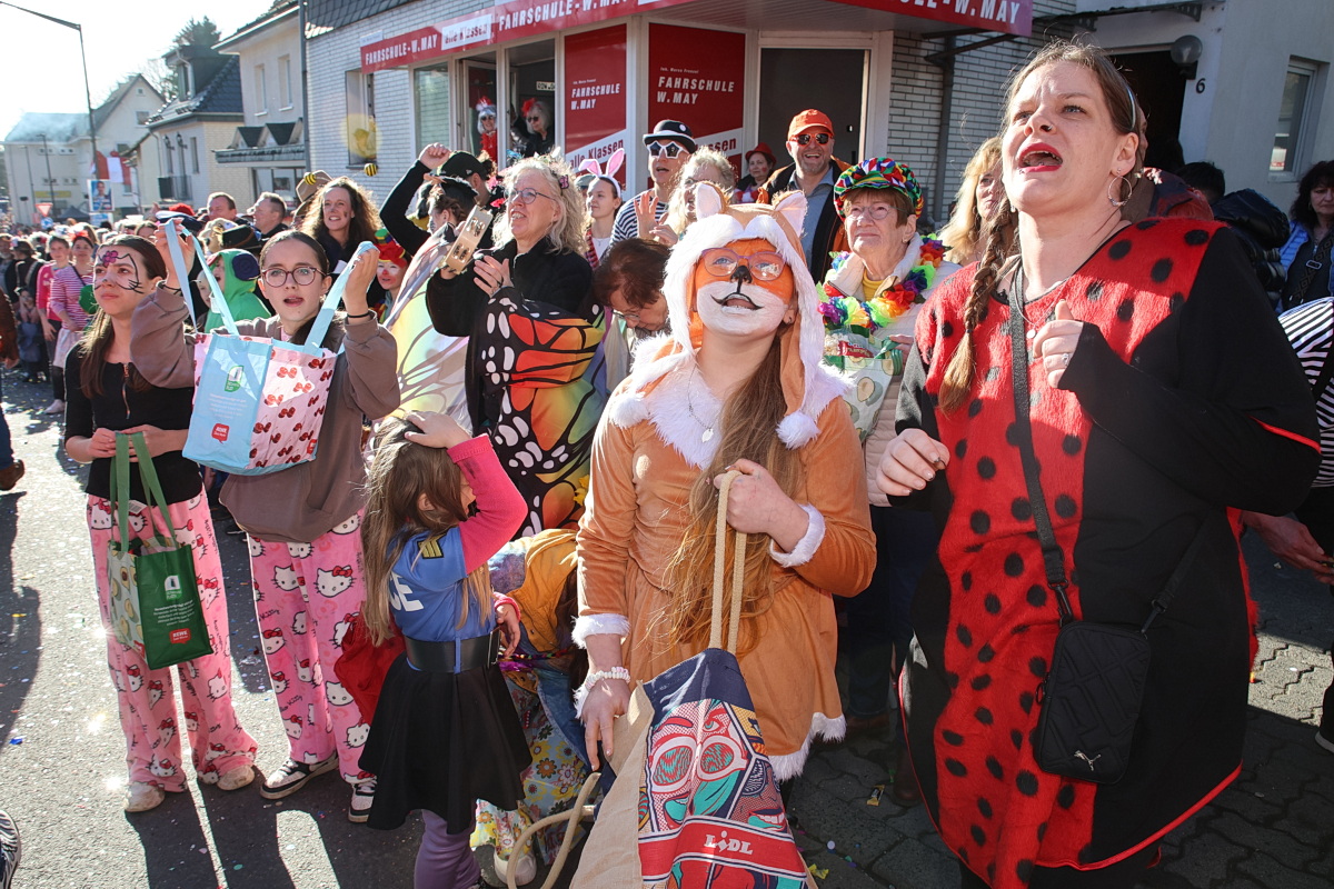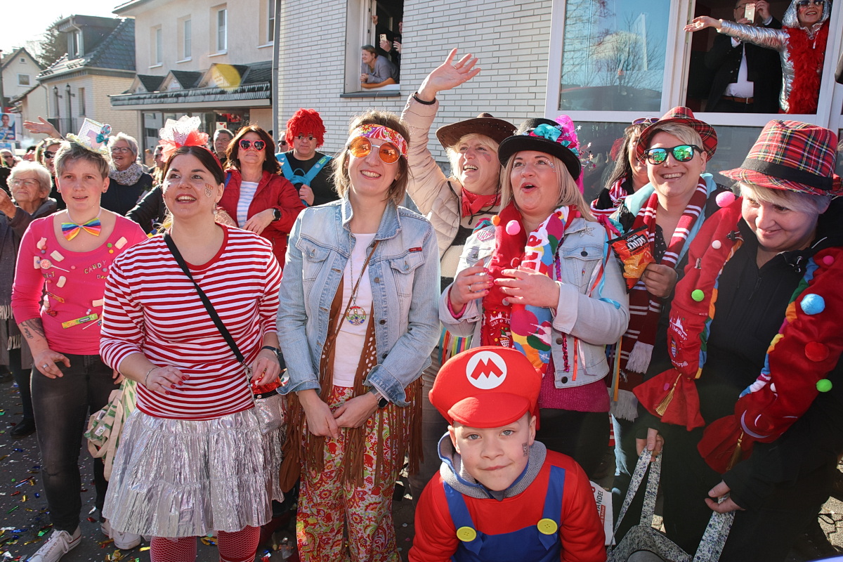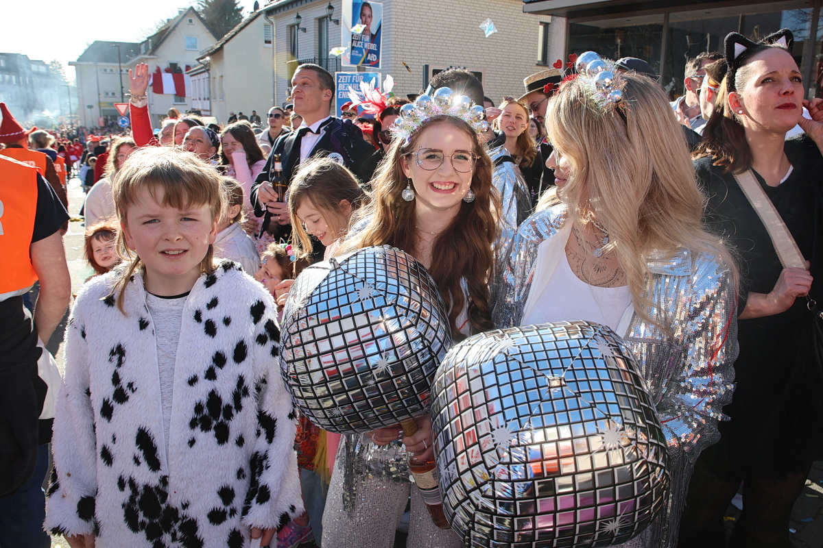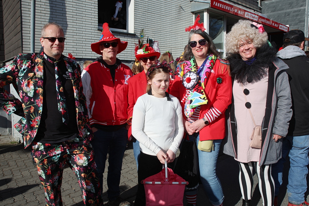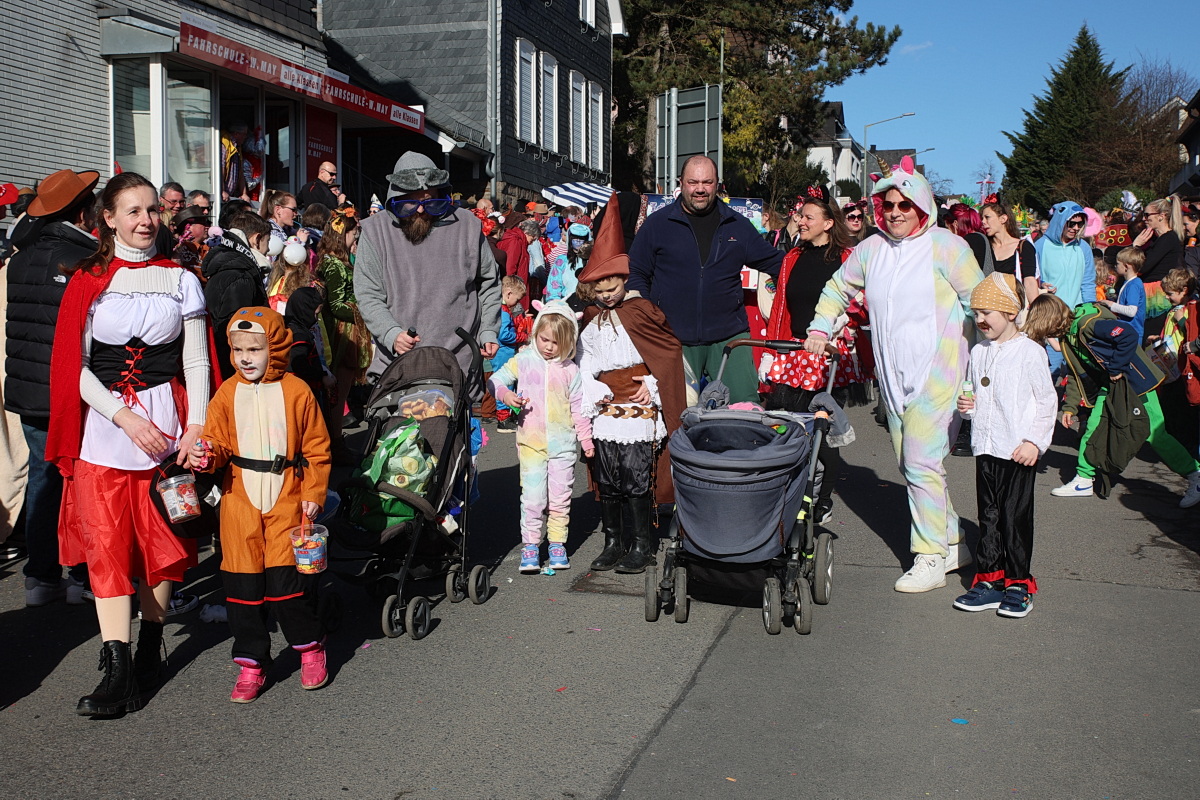 Aus der Obstschale waren freilaufende Erdbeeren, Ananasfrüchte und Bananen dabei, aus dem Mittelalter nahmen Ordensleute, Knappen und Edelleute teil, aus dem Tierpark waren Hirsche, Dinosaurier und Delfine entkommen. Zusammen mit Brausetütchen, Sonnenblumen, Zauberern und tausender bunt kostümierte Jecken bildeten sie entlang des Zugweges ein ansehnliches und eindringlich um Kamelle flehendes Zuschauerspalier, das sich ausgehend vom Bahnhof, entlang der Bahnhof-, Venn- und Talstraße bis hin zum Zugende an der Nutscheidhalle gebildet hatte.