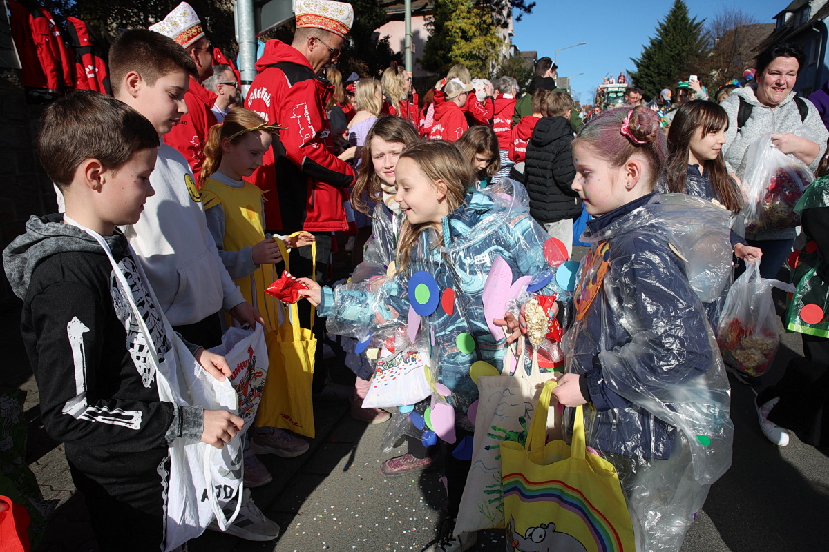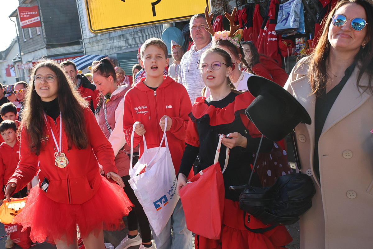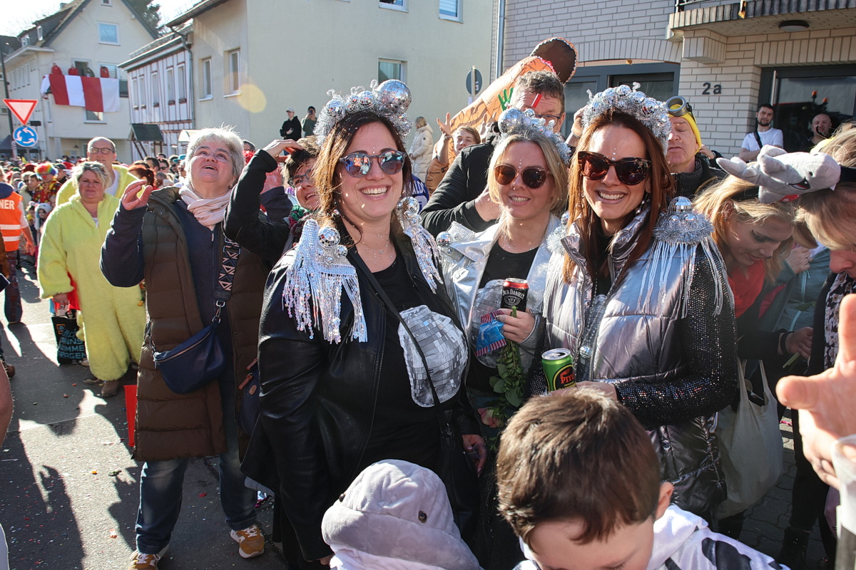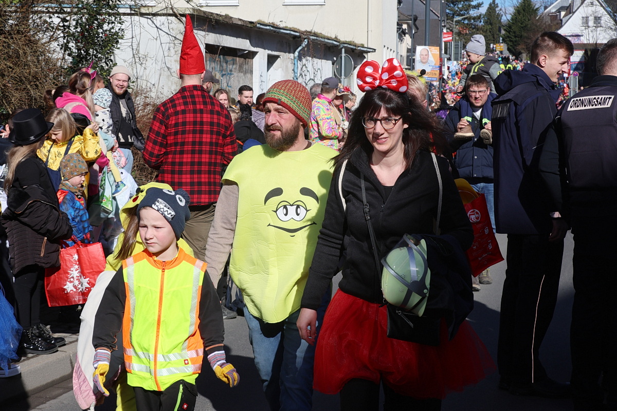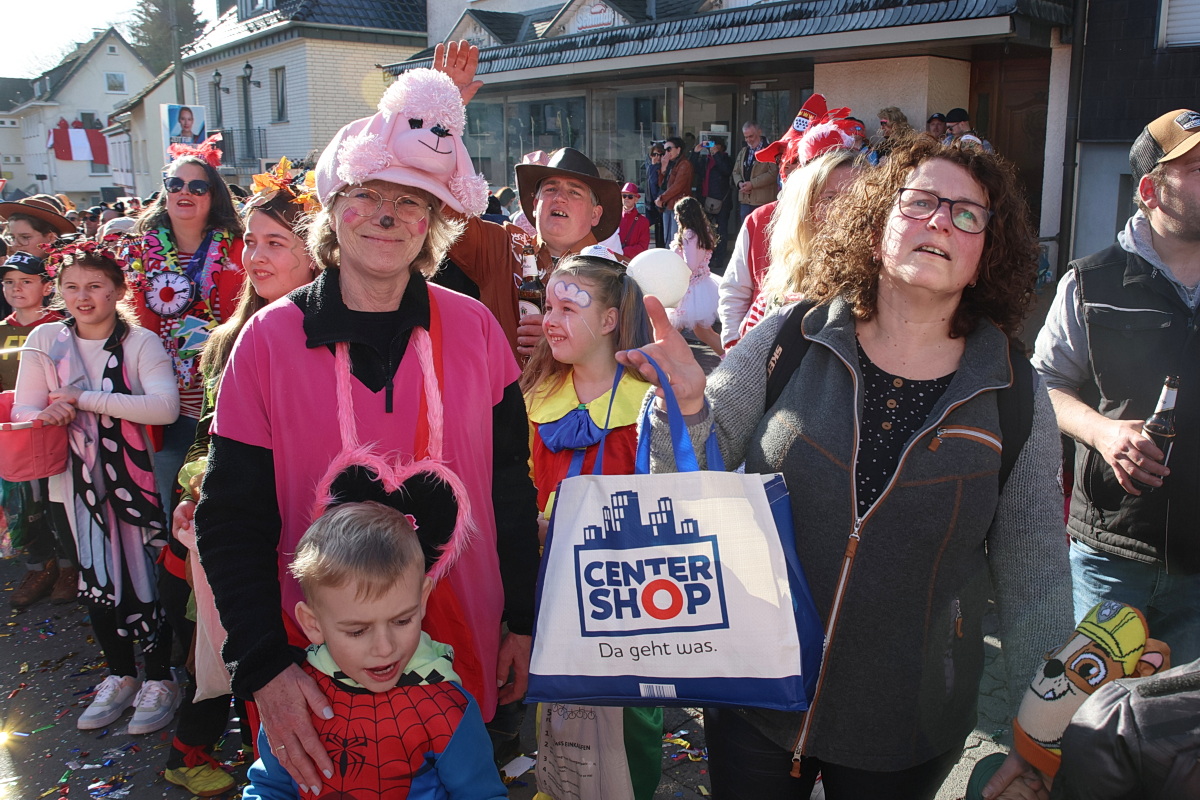 Aus der Obstschale waren freilaufende Erdbeeren, Ananasfrüchte und Bananen dabei, aus dem Mittelalter nahmen Ordensleute, Knappen und Edelleute teil, aus dem Tierpark waren Hirsche, Dinosaurier und Delfine entkommen. Zusammen mit Brausetütchen, Sonnenblumen, Zauberern und tausender bunt kostümierte Jecken bildeten sie entlang des Zugweges ein ansehnliches und eindringlich um Kamelle flehendes Zuschauerspalier, das sich ausgehend vom Bahnhof, entlang der Bahnhof-, Venn- und Talstraße bis hin zum Zugende an der Nutscheidhalle gebildet hatte.