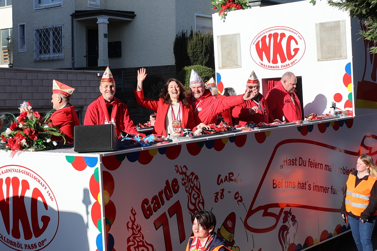 Als Zugsprecher bedankten sich Leo Wehling und WKG-Sitzungspräsident Henning Hergt bei den vielen WKG-Helfern, der Polizei, dem DRK, der Feuerwehr und dem Ordnungsamt, die zusammen mit den Zugleitern Thomas Nosbach und Manuel Salz, die Zugaufstellung trotz verschärfter Sicherheitsauflagen hatten Wirklichkeit werden lassen. Mit dem Hinweis „D´r Zoch kütt“, eröffnete Leo Wehling die Parade, die im strahlenden Sonnenschein die Anmutung einer bunten Perlenkette hatte. Als fester Bestandteil des Umzugs immer schon dabei der Musikverein Lichtenberg, der mit Dirigent Christian Böhmer einen schmissigen Auftakt setzte. Nach einem dreifachen „Lechtermech: Op d´r Hüh!“, folgte das dankende „Waldbröl pass op“.