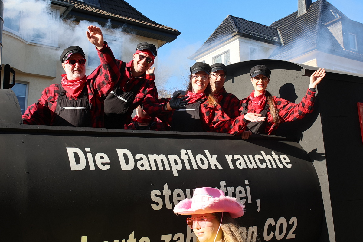Auch das Dreigestirn der KG "Tolle Elf" Wildberg mit Prinz Stephan I., Bauer René und Jungfrau Franka war in Begleitung ihrer Tanzgarden- Entourage nach Waldbröl gekommen und die sehenswerte Dampflok der Partyvögel transportierte das Motto „Die Dampflok rauchte steuerfrei, heute zahlt man CO2“.