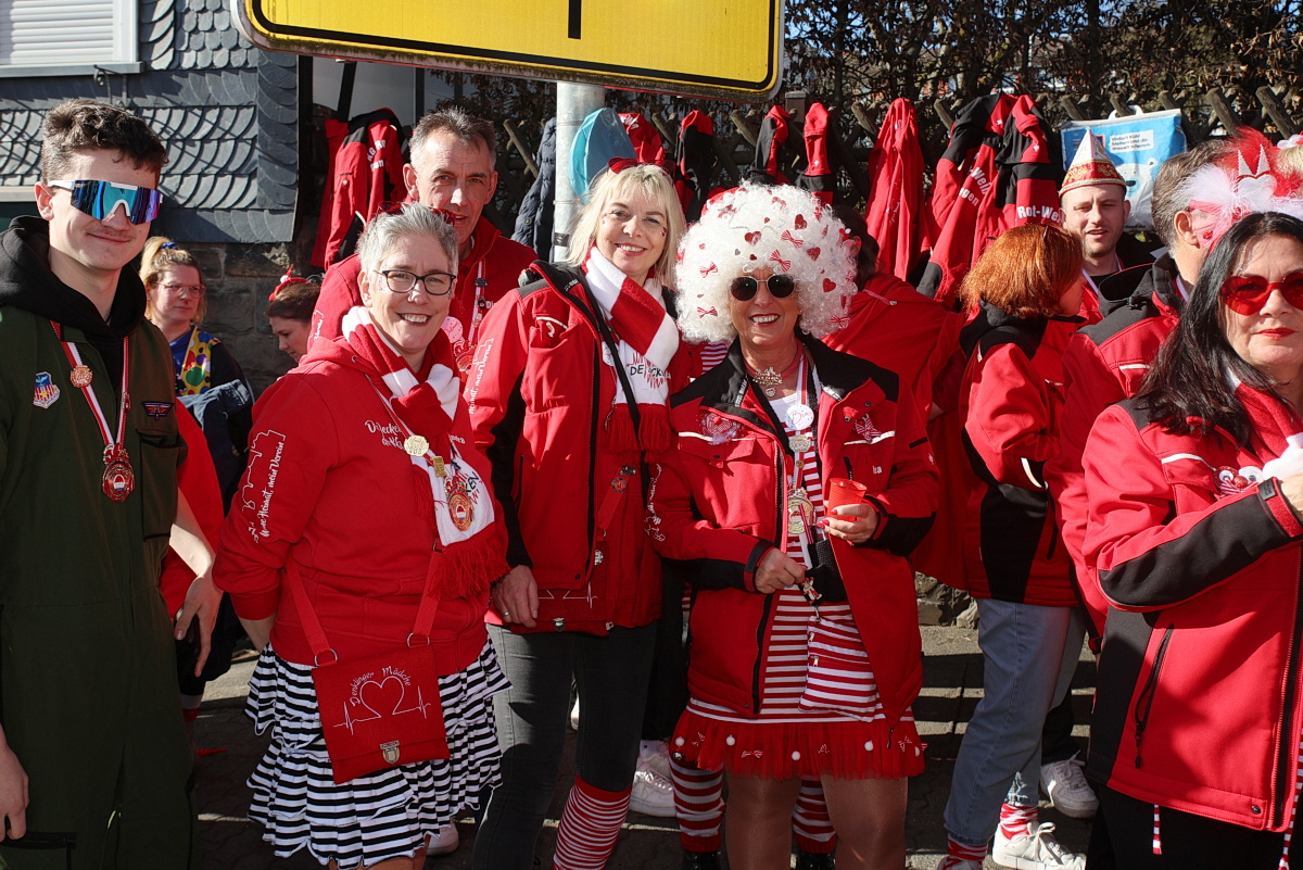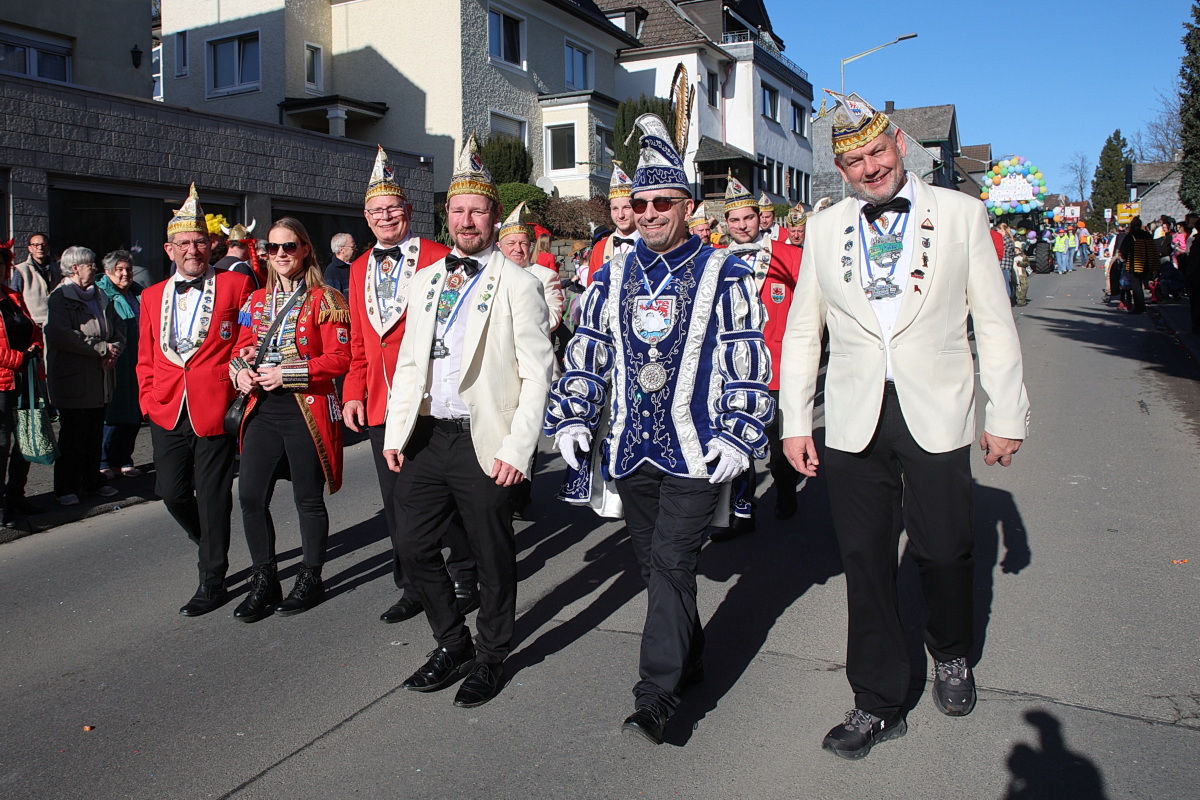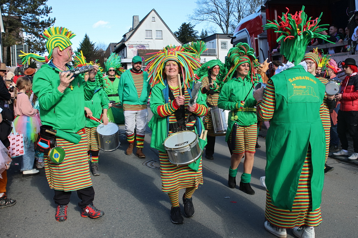 Vom Wagen der KG Dattenfeld 1935 grüßte das Kinderprinzenpaar Antonia I. und Paul I. die in Begleitung der Windecker Burggarde und des Vorstandes angereist waren. Ebenfalls aus Windeck stammend, verbreiteten die Musiker der Rhythmusgruppe SambaWind mit den Instrumenten Sudo, Caixa, Agogo dem Repi und Shaker brasilianisches Karnevalsflair in der Marktstadt. Gestern war die WKG auf der Sitzung in Asslar, heute ging eine Abordnung der Freunde aus Hessen im Waldbröler Zug mit.