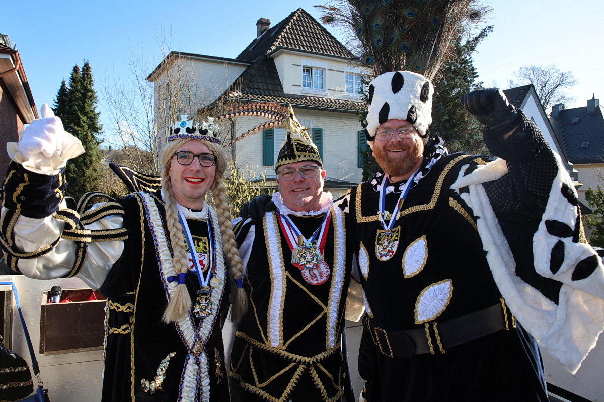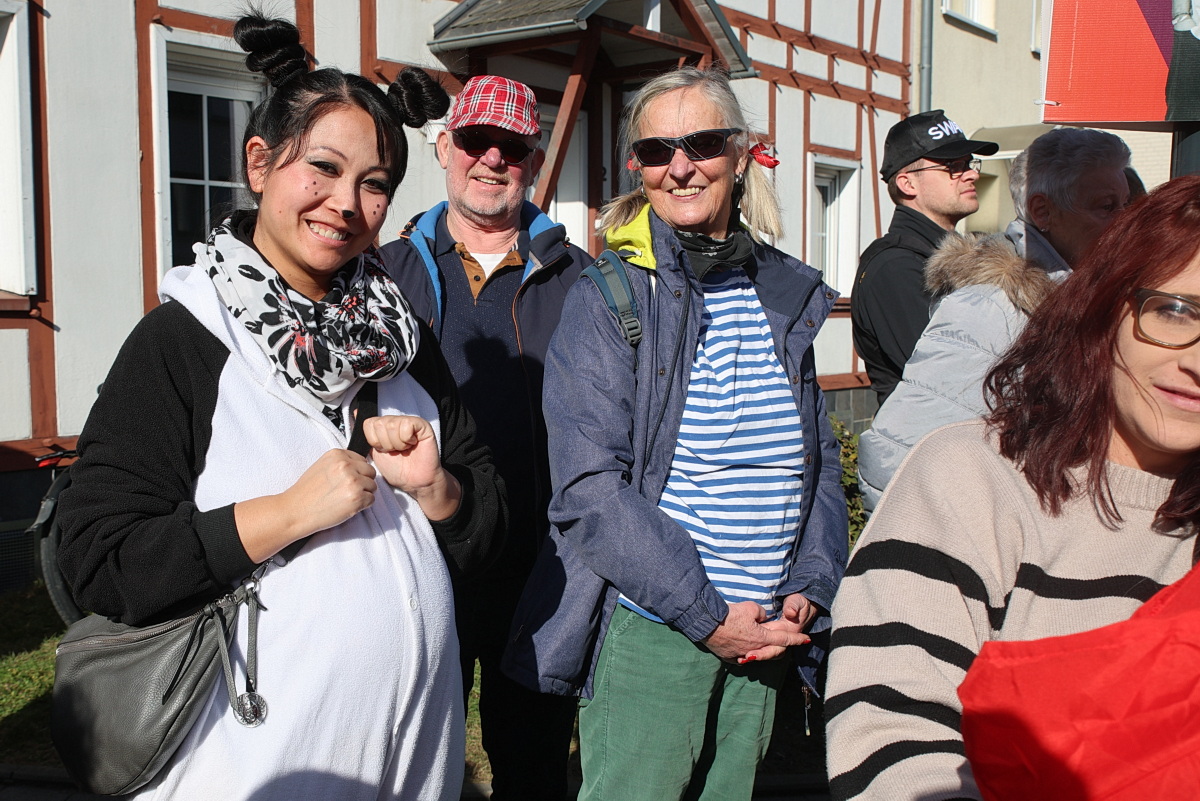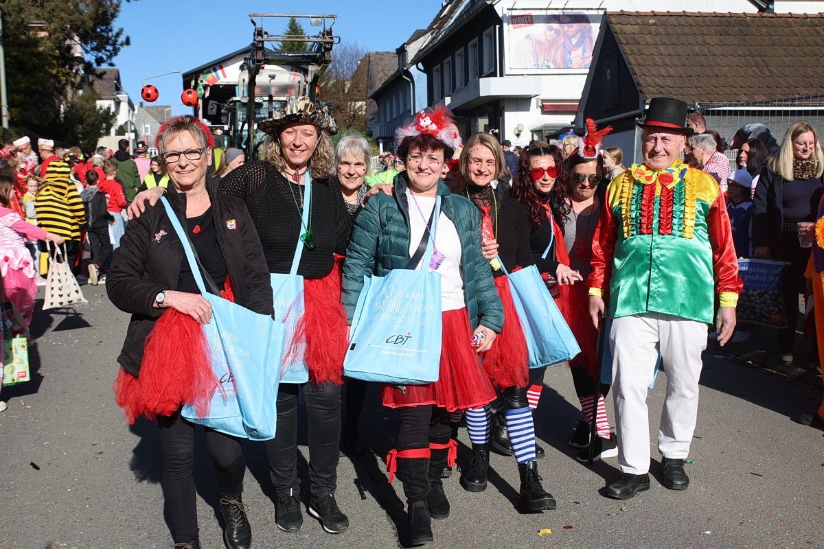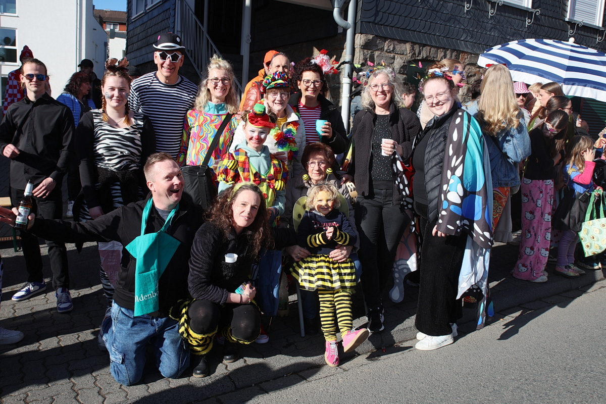 Vom Wagen der KG Dattenfeld 1935 grüßte das Kinderprinzenpaar Antonia I. und Paul I. die in Begleitung der Windecker Burggarde und des Vorstandes angereist waren. Ebenfalls aus Windeck stammend, verbreiteten die Musiker der Rhythmusgruppe SambaWind mit den Instrumenten Sudo, Caixa, Agogo dem Repi und Shaker brasilianisches Karnevalsflair in der Marktstadt. Gestern war die WKG auf der Sitzung in Asslar, heute ging eine Abordnung der Freunde aus Hessen im Waldbröler Zug mit.