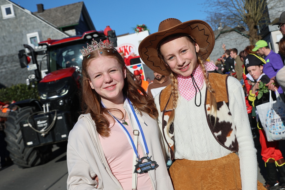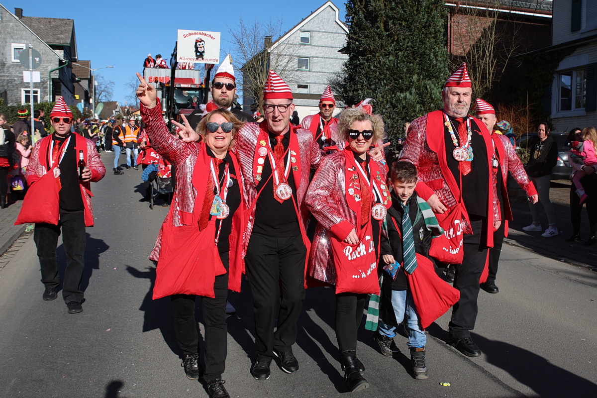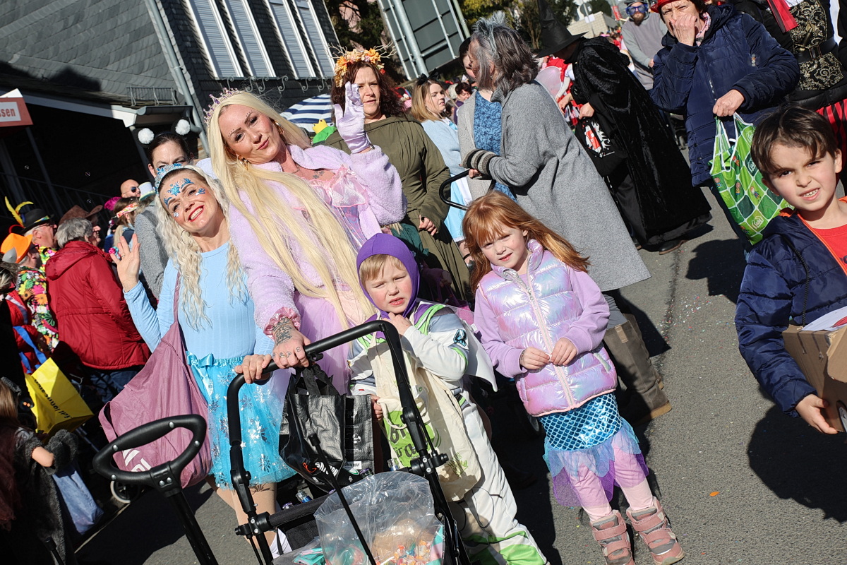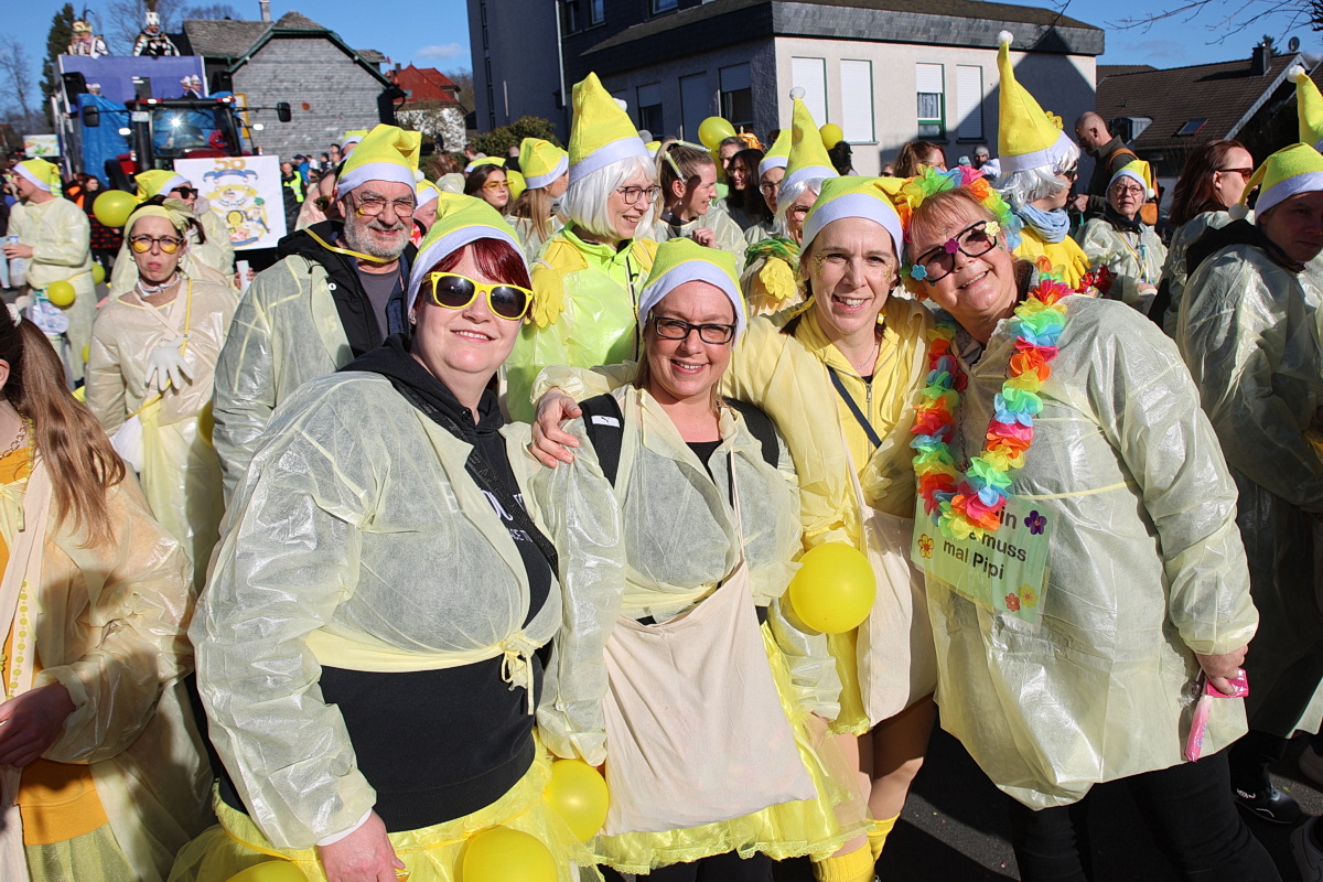 Vom Wagen der Karnevalsfreunde Schönenbach hielten Prinzessin Tanja I. und Prinz Oliver I. (aus dem Hause Tietz) Hof, die Karnevalsfreunde Ospel Jung und Alt huldigten mit Wagen und Verkleidungen dem mexikanischen Feiertag Dia de Muertos. Ulkig die große Fußgruppe des Klinikums Oberberg, deren Teilnehmende aus Marienheide, Gummersbach, Waldbröl und Bergisch Gladbach in gelben Overalls und gelber Kopfbedeckung ein sehr menschlichem Bedürfnis verkörperten: „Urin: Egal wer oder was du bist - Pippi müssen alle“.