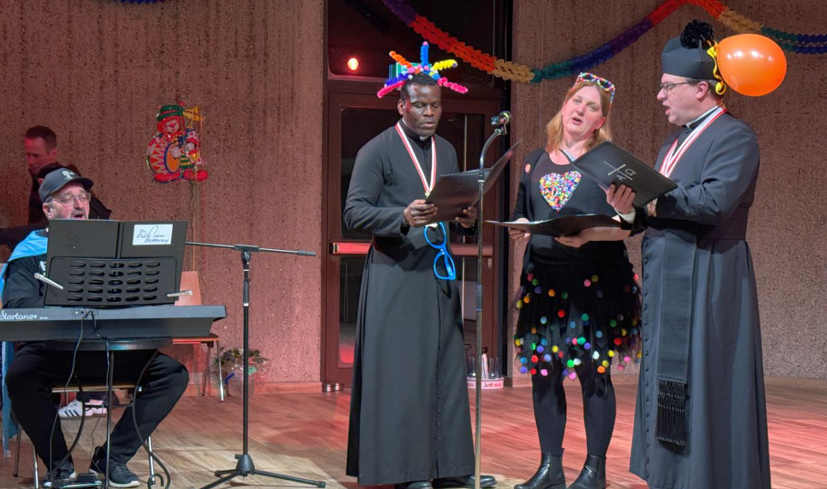 Das „Pastoralteam“ stellte seinen Humor unter Beweis, indem es zur Musik von „Yellow Submarine“ ein „Wir singen alle für Cäcilia“ und aus „Yesterday“ ein „Pfarrer sein“ erklingen ließ. Nachdem die Mini-Wolpis Showtänze rund um das Thema „Barbie“ präsentiert hatten, hieß es für die Laien-Schauspieler der Morsbacher Theatergruppe: Bühne frei. Brillant, feinfühlig und mit viel Hingabe präsentierten sie den Zuschauern, angelehnt an Loriots Sketch aus „Weihnachten bei Hoppenstedts“ (1978), wie gleich drei Vertreter für Weinproben, Staubsauger und Haarbläser sowie Versicherungen bei einer Hausfrau parallel erscheinen, um sie von der Qualität ihrer jeweiligen Produkte zu überzeugen. Das Publikum honorierte die Leistung mit viel Gelächter und Applaus.