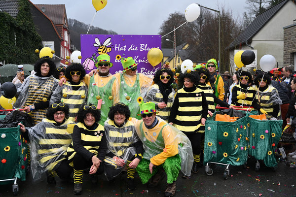Insgesamt 24 Fußgruppen und Wagen schlängelten sich pünktlich ab 14:11 Uhr von der Jagdhütte am Ortseingang in Richtung des karnevalsverrückten Ortskerns und ließen neben dem Regen von oben, der zumindest phasenweise immer wieder stoppte, zentnerweise Kamelle, Strüssje und Konfetti auf die vielen kostümierten Jecken am Straßenrand herabregnen – die Veranstalter rechneten mit etwa 10.000 Schaulustigen im Vorfeld.