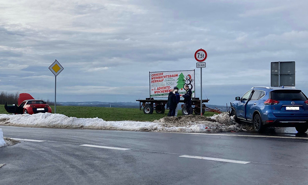 Red; 14.01.2026, 09:49 UhrRadevormwald - Zwei Autos stießen im Kreuzungsbereich der Kreisstraße 6 und der Landstraße 130 zusammen - Alle Beteiligten kamen in Krankenhäuser - Kennzeichen eines Autos waren gestohlen.