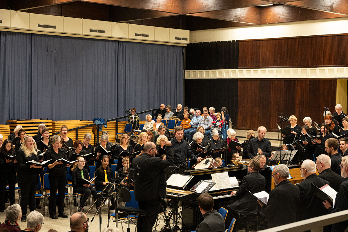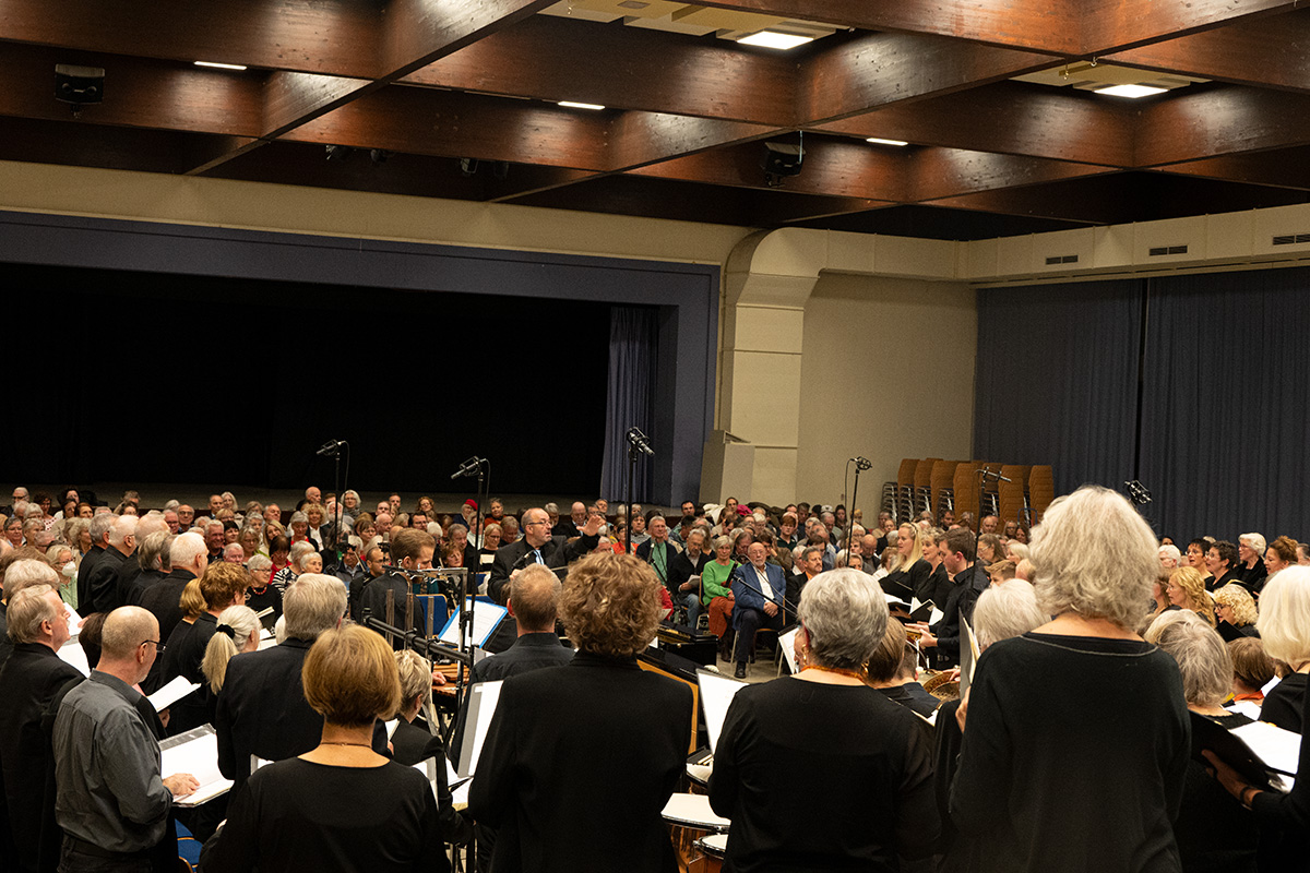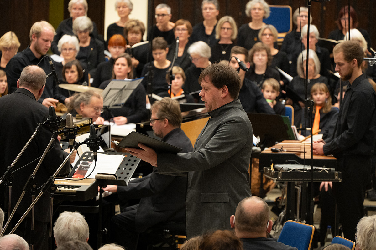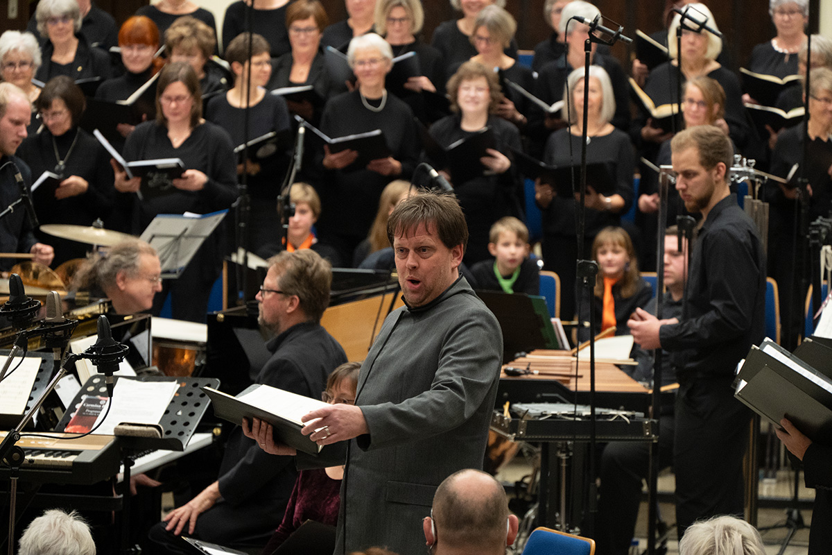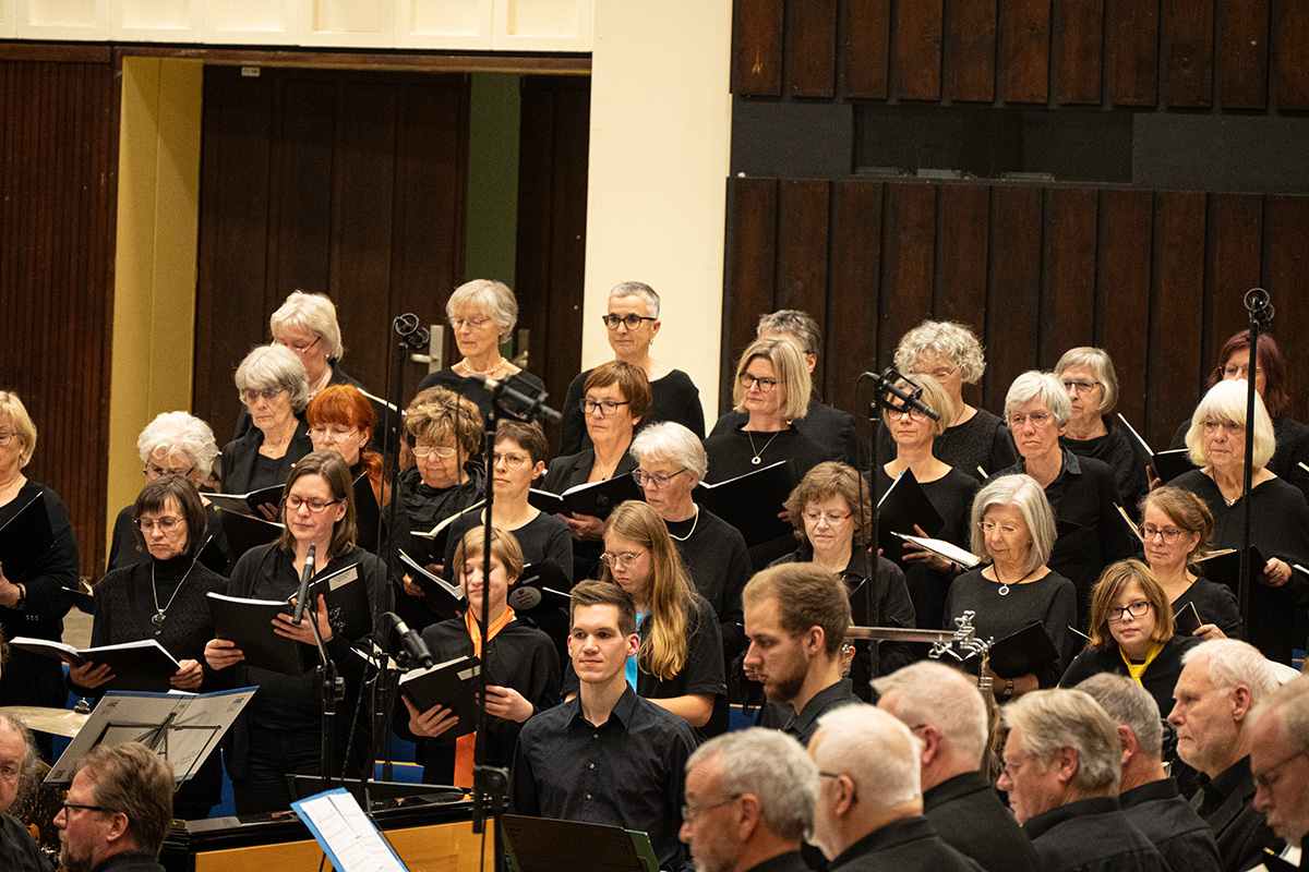 [Dr. Dirk van Betteray realisierte wieder einmal ein brillantes Projekt mit einem großen Aufgebot an Sängerinnen und Sängern, die auf die kleinsten Bewegungen des Dirigenten reagierten.]