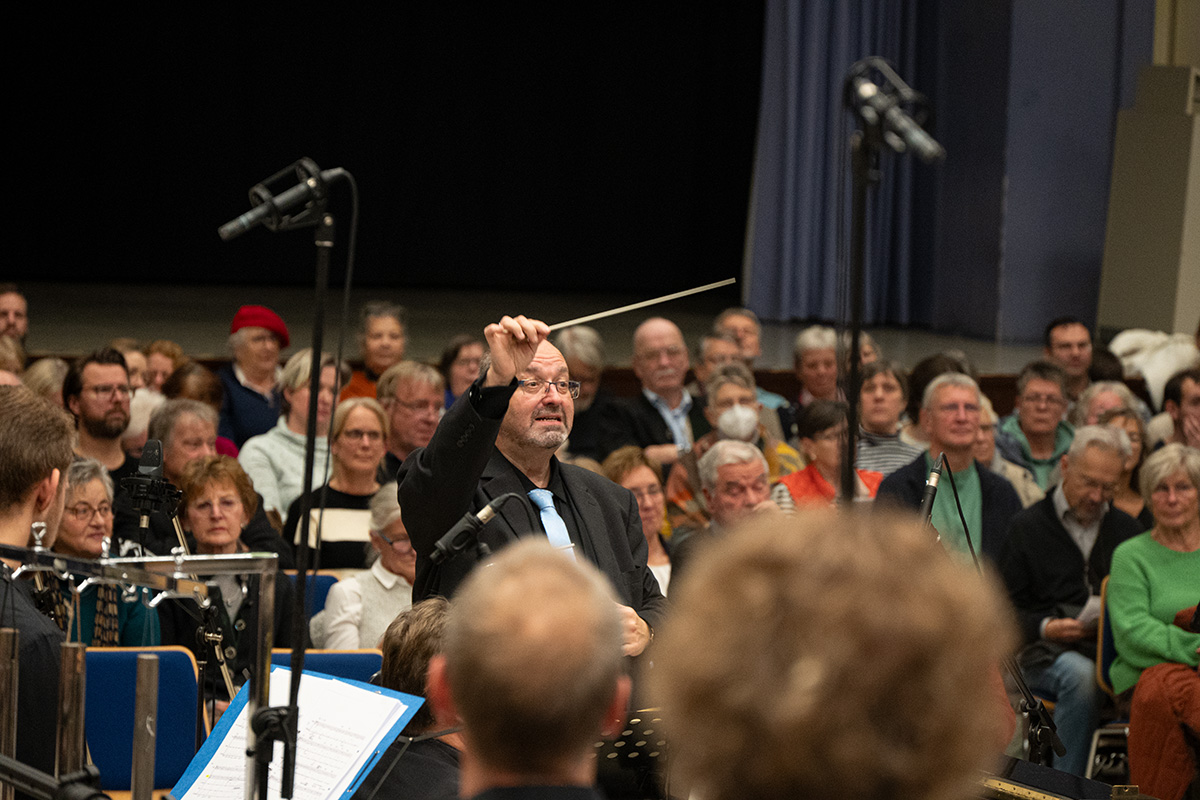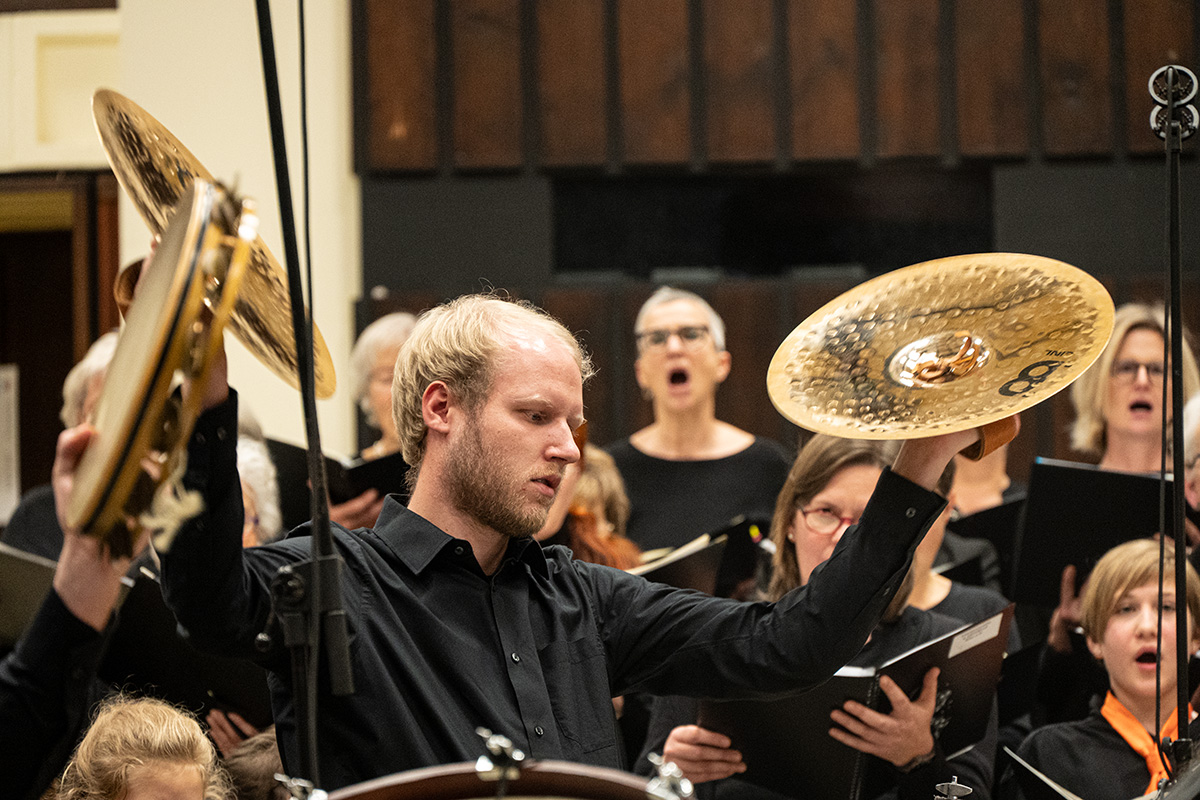Damit wurde er als Künstler bekannt und mit einem Dreiklang aus Musik, Tanz und Sprache wollte er Kinder für Musik begeistern, was die Grundidee von Carl Orffs "Schulwerk" war. Magisch allerdings auch das Gesamtwerk in Bielstein, bei dem das Publikum Lieder wie „O Welt, ich muss dich lassen“ von Heinrich Isaac in einem Satz von Johann Sebastian Bach oder auch das „In dir ist Freude“ von Giovanni Gastoldi mitsingen durfte. Mittendrin Dr. Dirk van Betteray, der Punktgenau die Einsätze für das Gesangs-Ensemble und die Musiker gab.