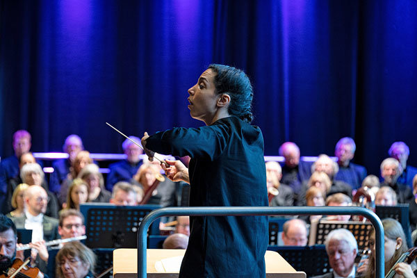 [Einsätze sowie Betonungen und musikalische Bewegungen verdeutlichte Dirigentin Bar Avni beeindruckend mit vollem Körpereinsatz und Mimik.]