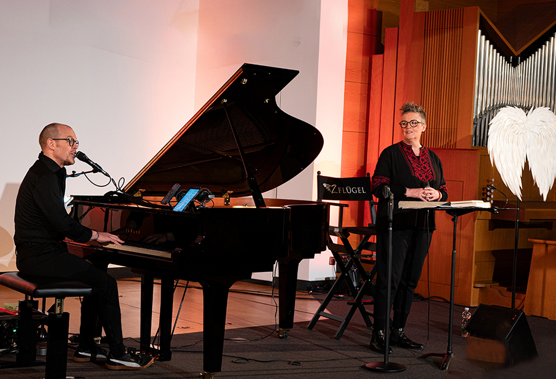Ein Abend mit „2Flügel“ ist kein Konzert, ist keine Lesung, aber beides gleichzeitig. Ben Seipel liebt Musik. Und sein Instrument, den Flügel. Christina Brudereck liebt es, Geschichten zu erzählen. Christina Brudereck ist Theologin und Schriftstellerin. Sie verbindet Kultur, Politik. Im ausverkauften Gemeindehaus gab es so kurz vor der Karwoche passend zur Passionszeit Lieder und Geschichten von Liebe und Leid. Vom Leben angesichts des Todes. „2Flügel“ erinnerten an die Passion von Jesus. An das Feuer seiner Liebe.
