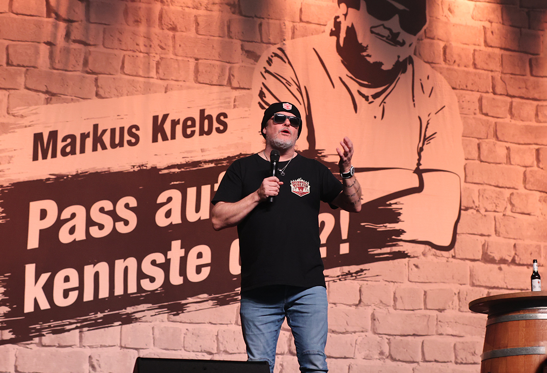 Wenn sich Wintermütze und schwarze Sonnenbrille in Richtung Bühne begeben, dann kann sich nur ein Spaßakrobat dahinter verstecken. Markus Krebs alias "Der Mann hinter dem Bauch" oder "Die Ruhrpottperle" unterhielt rund 1.800 Gummersbacher in der SCHWALBE arena. In seinem Programm "Pass auf...kennste den?!" thematisiert der Duisburger eine Ansammlung von Anekdoten, die meist mit seinem Wohnzimmer, der Kneipe ums Eck, zu tun haben und häufig nicht ganz jugendfrei sind.