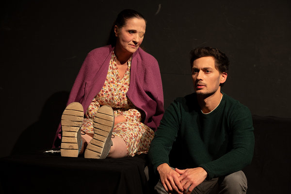 Ein geschickt gestricktes szenische Gefüge bei dem Regisseur Thorsten Schmidt die Szenen ineinander übergehen lässt mit kurzen „Blacks“. Schwarz ist auch die Bühne in verschieden hohen und schwarz abgedeckten Stufen und mit nur zwei Stühlen und einem Tisch – mit schwarzem Klebeband umwickelt. Die sechs Darsteller tauchen immer im Duo auf. Drei Paare: das Ehepaar Malin (Elisa Huland) und Gunnar (Kaspar J. Zekorn), die beiden Polizisten Alf (Peter Becker) und Unni (Nea Ylva Kara) und das Geschwisterpaar Inga (Britta Radzwill) und Petter (Jared Wilkes) wechseln sich ab.