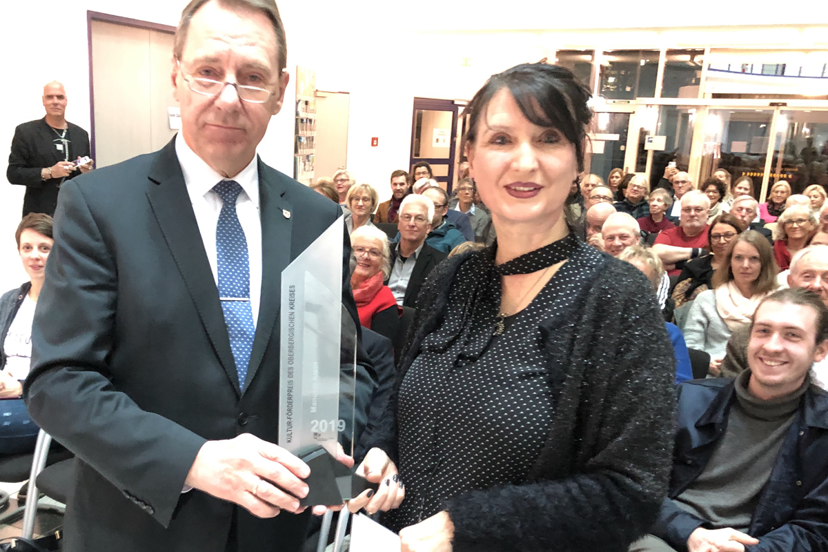 Das Foyer des Gummersbacher Kreishauses hat sich am Dienstagabend in eine Bühne verwandelt. Landrat Jochen Hagt moderierte die Verleihung des Kultur-Förderpreises des Oberbergischen Kreises 2019. Die Gewinner der Auszeichnung wurden für ihre Verdienste, das kulturelle Leben zu würdigen, oder für ihre künstlerischen Leistungen belohnt. In diesem Jahr gab es keine Sparteneingrenzungen, sodass sich insgesamt 27 Künstler aus den Bereichen Bildende und Darstellende Kunst, Literatur sowie Musik und Medienkunst beworben hatten.