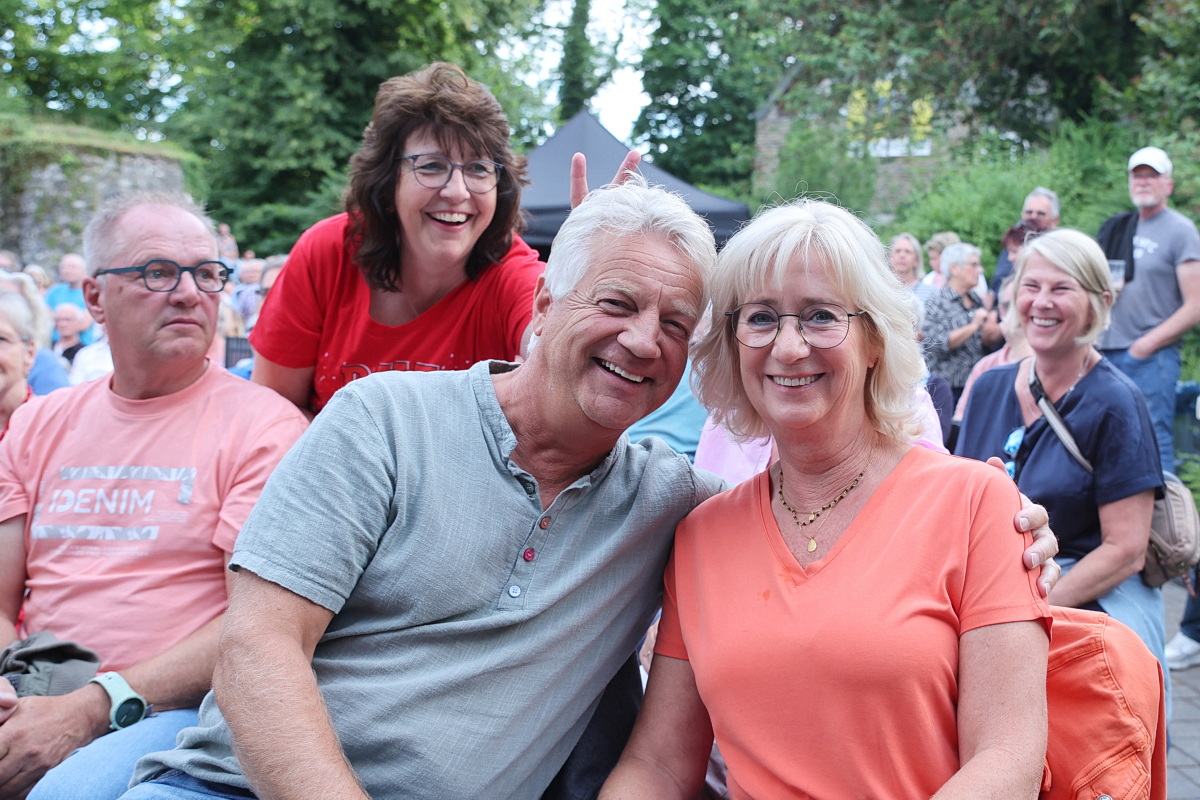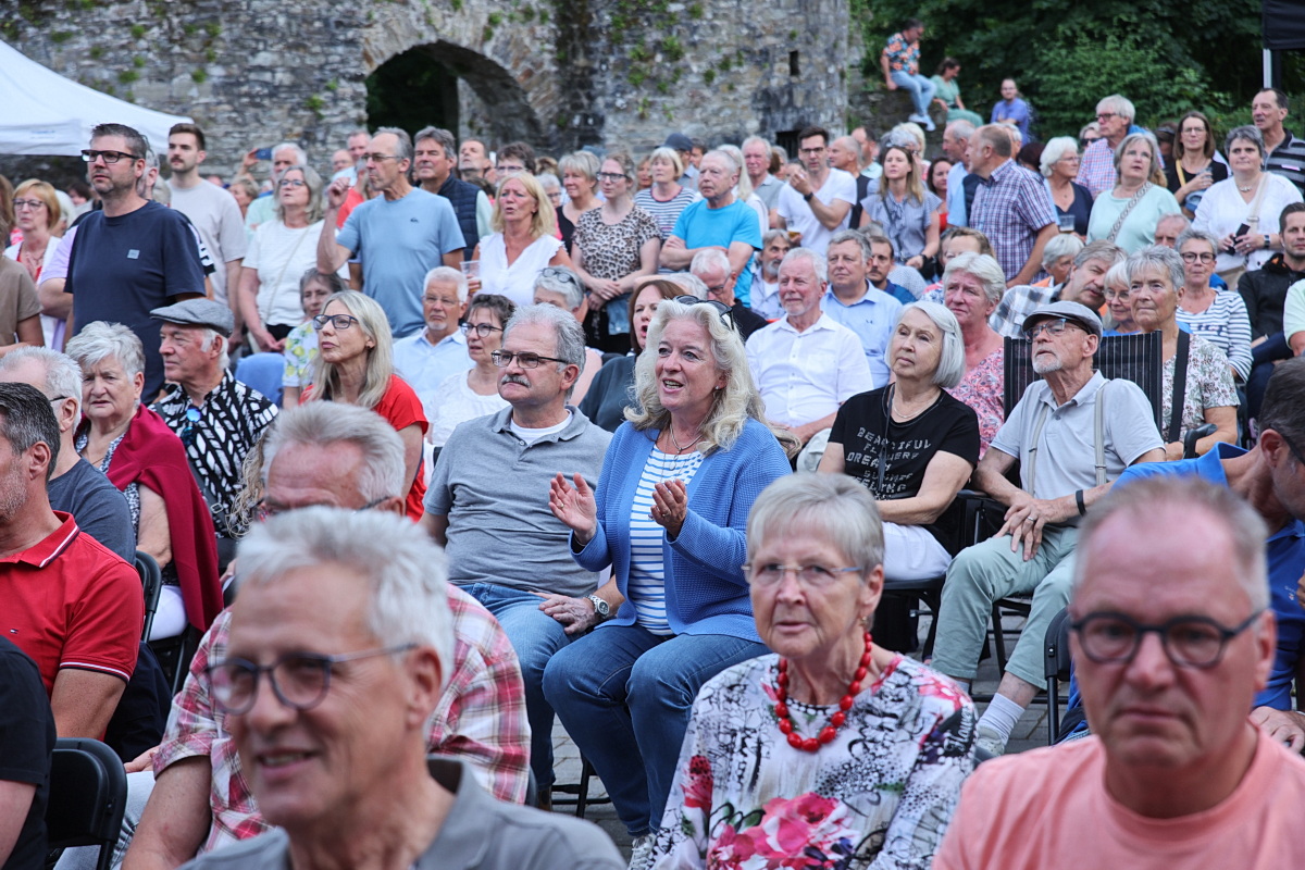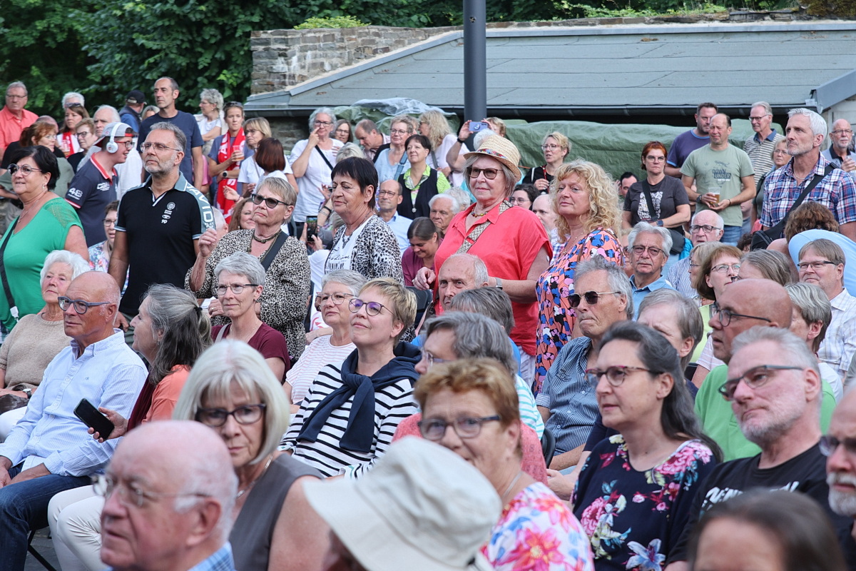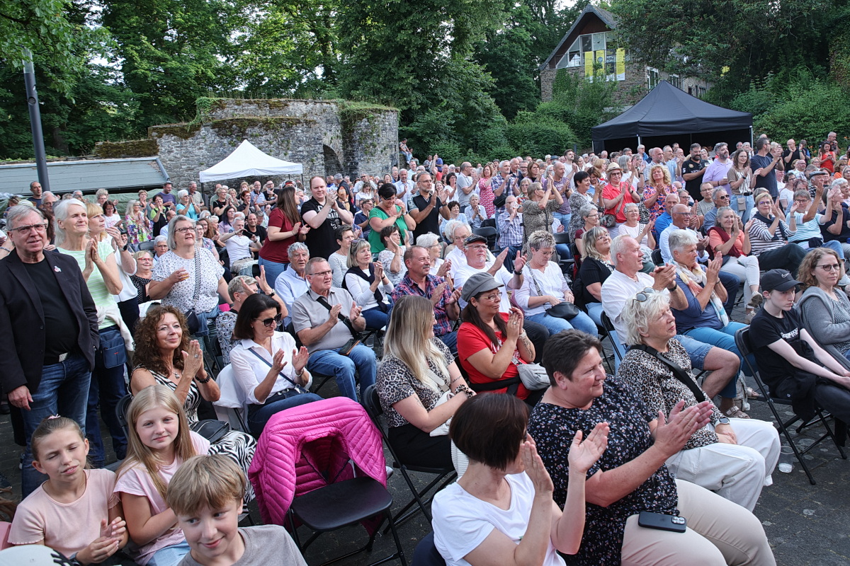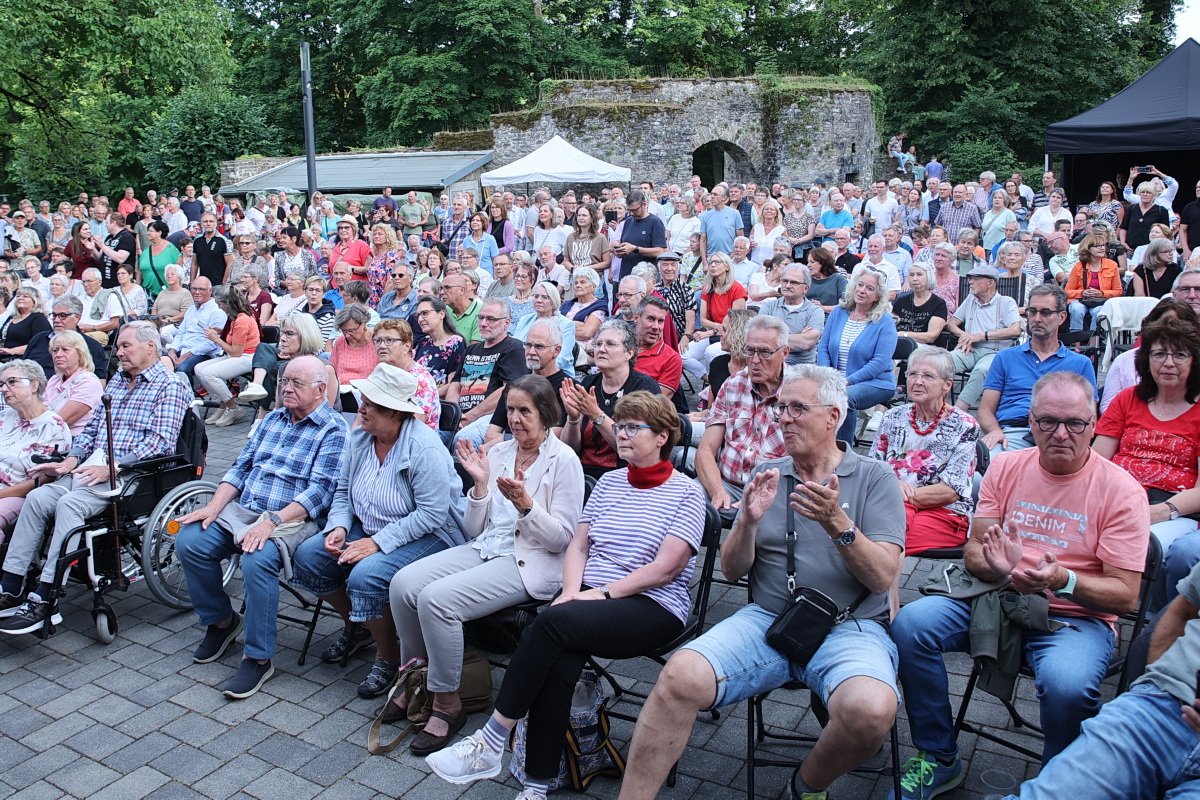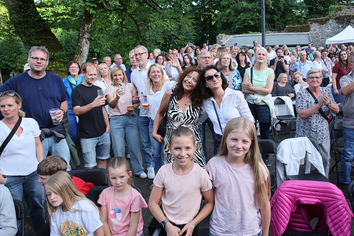 Kein Wunder also, dass das Open-Air mit den Bläck Fööss auf Schloss Homburg gestern rund 500 Fans in die „gute Stube“ des Oberbergischen Kreises lockte, wo sie den Auftritt der sechs Stars aus der Rheinmetropole zu einem glatten Heimspiel werden ließen. Dass Mirko Bäumer, Christoph Ganderath, Pit Hupperten, Hanz Thodam, Andreas Wegener und Alex Vesper nicht allein vom musikalischen Erbe und den Ideen ihrer Vorgänger leben, stellten sie zu Konzertbeginn mit „En d`r Altstadt weed en Bud frei“ von 2022 und „Alles hät sing Zick“ von 2024 unter Beweis, die vom gut aufgelegten Publikum direkt begeistert abgefeiert wurden.