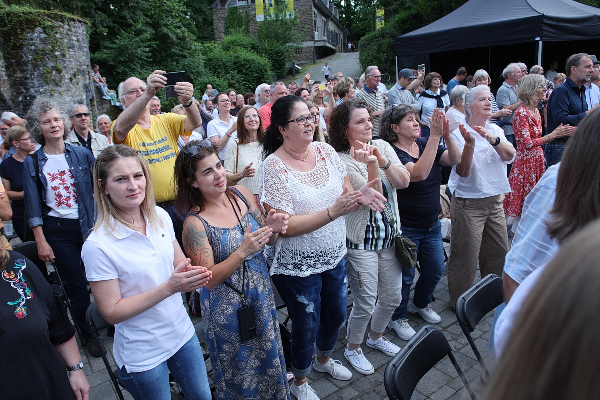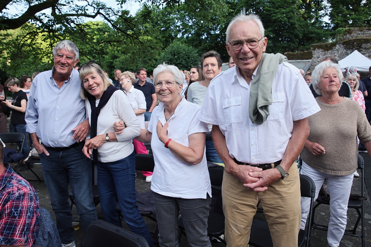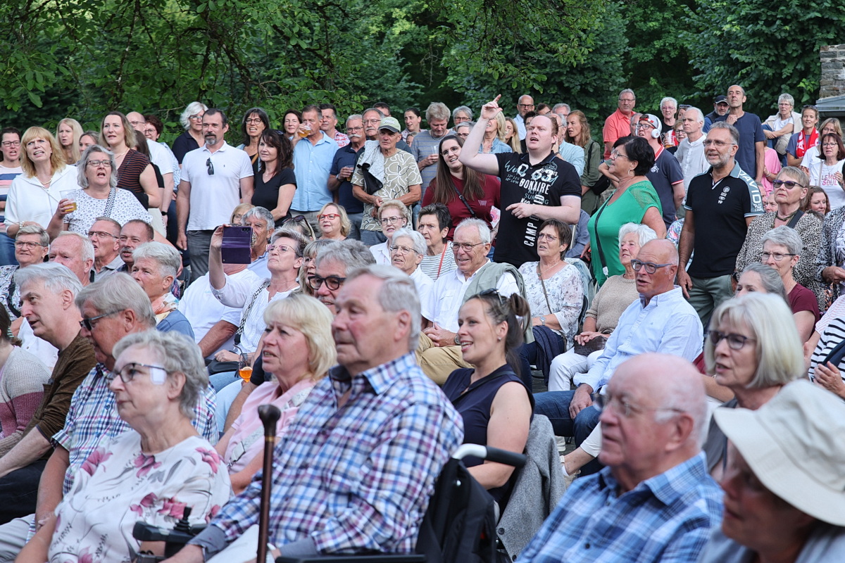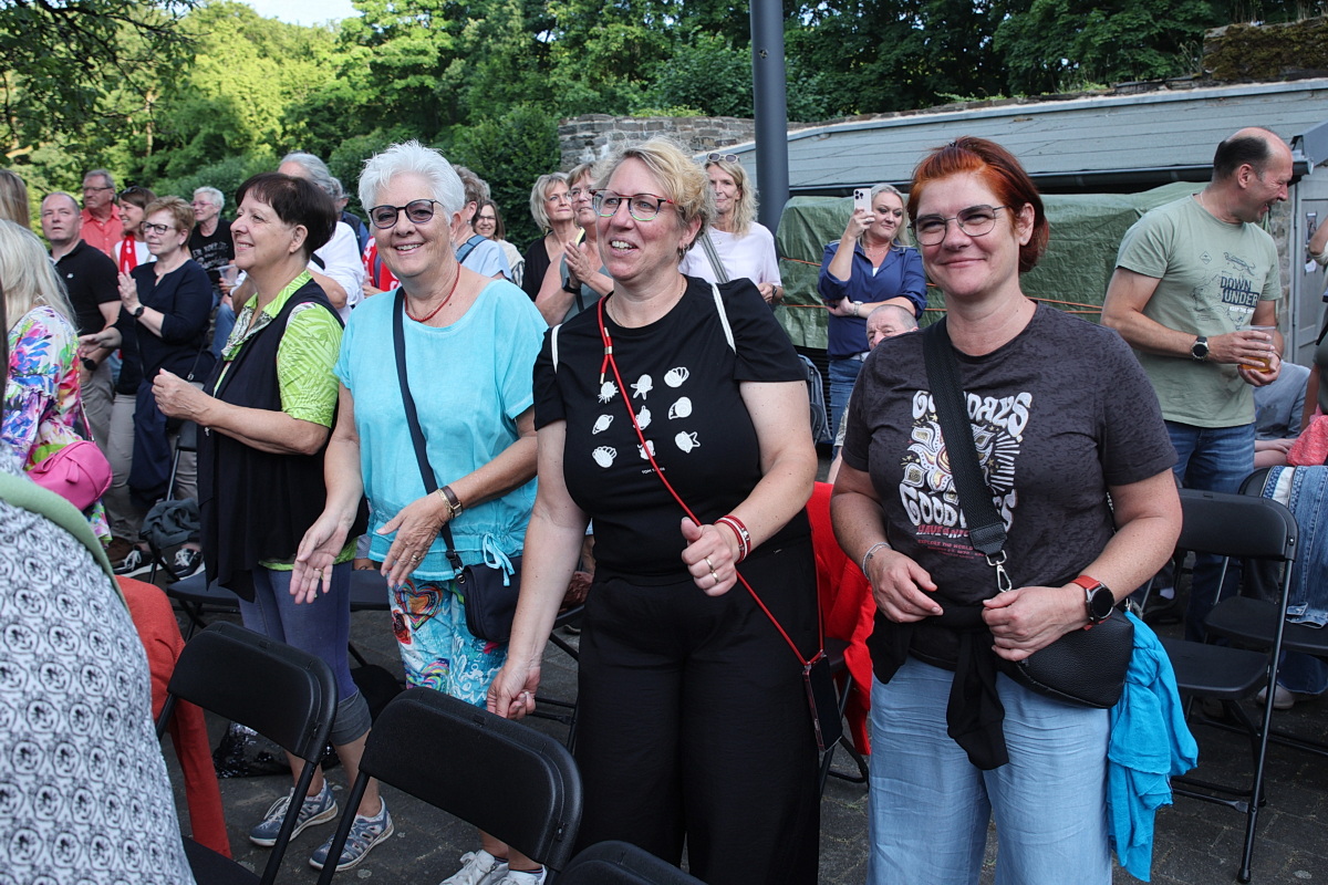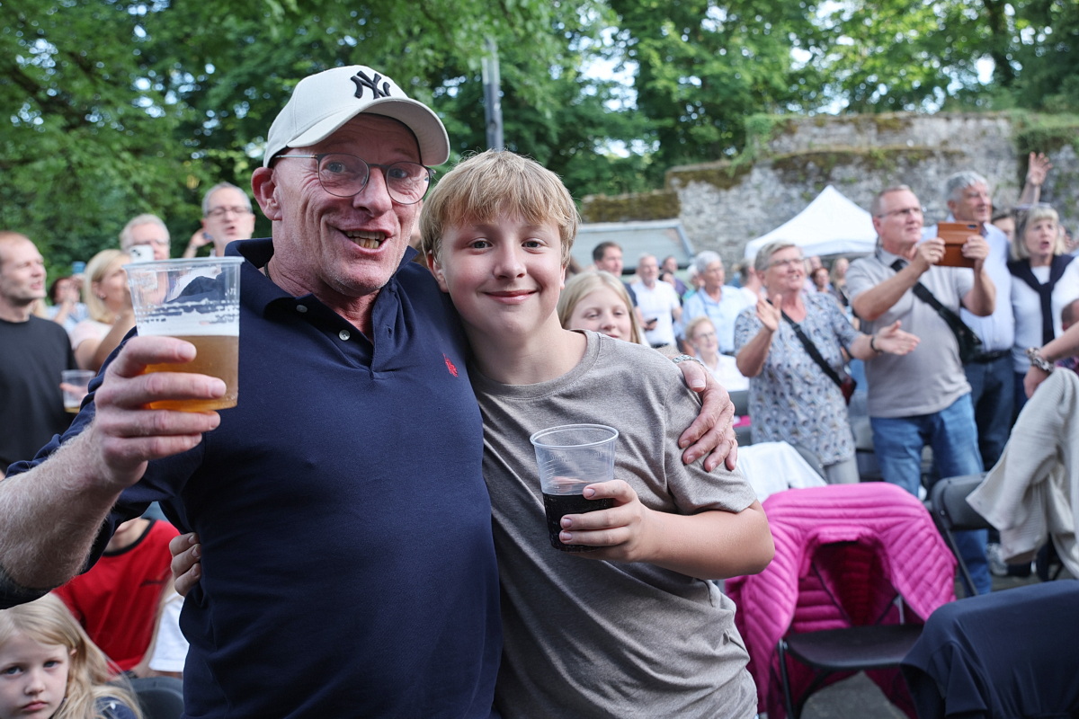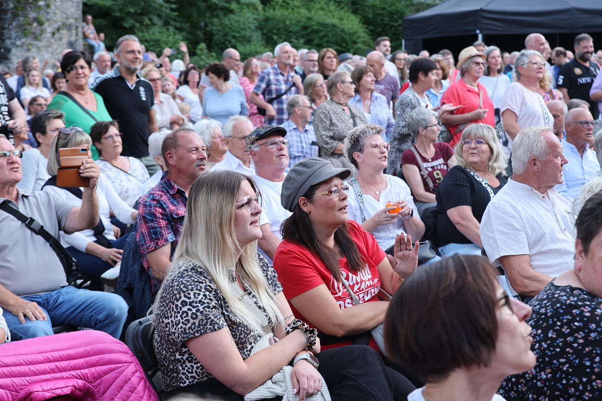 Kein Wunder also, dass das Open-Air mit den Bläck Fööss auf Schloss Homburg gestern rund 500 Fans in die „gute Stube“ des Oberbergischen Kreises lockte, wo sie den Auftritt der sechs Stars aus der Rheinmetropole zu einem glatten Heimspiel werden ließen. Dass Mirko Bäumer, Christoph Ganderath, Pit Hupperten, Hanz Thodam, Andreas Wegener und Alex Vesper nicht allein vom musikalischen Erbe und den Ideen ihrer Vorgänger leben, stellten sie zu Konzertbeginn mit „En d`r Altstadt weed en Bud frei“ von 2022 und „Alles hät sing Zick“ von 2024 unter Beweis, die vom gut aufgelegten Publikum direkt begeistert abgefeiert wurden.