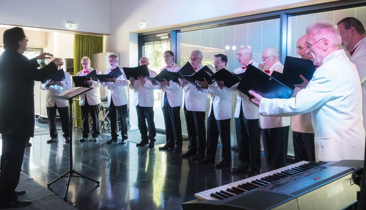 Nach dem Abendständchen von Felix Mendelssohn-Bartholdy und Liedern von Franz Schubert sorgten die Text-Bearbeitungen (Heinz E. Klockhaus) von Liedern von Friedrich Silcher für Schmunzeln im Publikum. Nach der Pause versetzten Harald Stein und Michael Dunkel mit den ersten Noten ihrer kölschen Lieder das Publikum in Schunkellaune. „Jecke am Ring“, das „Wasser von Kölle“ und weitere Ohrwürmer wurden präsentiert.