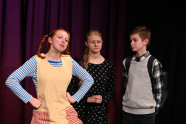Schnell freundet sie sich mit dem Geschwisterpaar Thommy (Clemens Müller) und Annika (Lara Christin Vögeler, die perfekt dieses sehr artige Mädchen spielt) an und möchte zwar nicht „Plutimikation“ in der Schule lernen, aber wie die anderen auch Sommer- und Weihnachtsferien haben. Der Lehrerin (Silke Faber in der Premiere) macht sie das Leben schwer und auch die beiden Polizistinnen (Alina Ludwig und Marita Hermann) haben ihre Mühe mit ihr. Denn ihr Motto: „Ich mache mir die Welt, widewide wie sie mir gefällt“. Das missfällt natürlich Fräulein Prysselius (toll dargestellt von Bärbel Stinner), die Pippi in ein Waisenhaus stecken möchte.