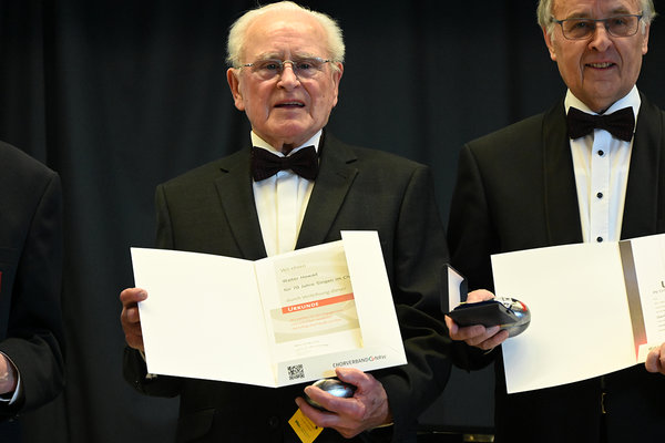 [Seit 70 Jahren singt Walter Howad aktiv als erster Bass – außer ihm wurden noch zwei weitere Herren für ihre Chortätigkeit seit 1953 geehrt.]