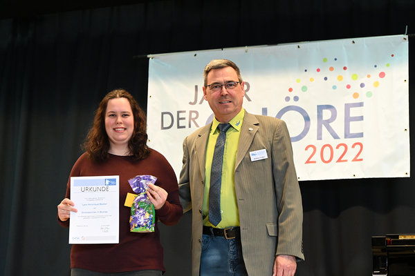 [Lara Veronique Becker erhielt für „5 Jahre aktives Singen“ im Jugendchor „The Young Voices“ eine Ehrung – sie ist die Tochter von Kreischorleiter Achim Becker.]