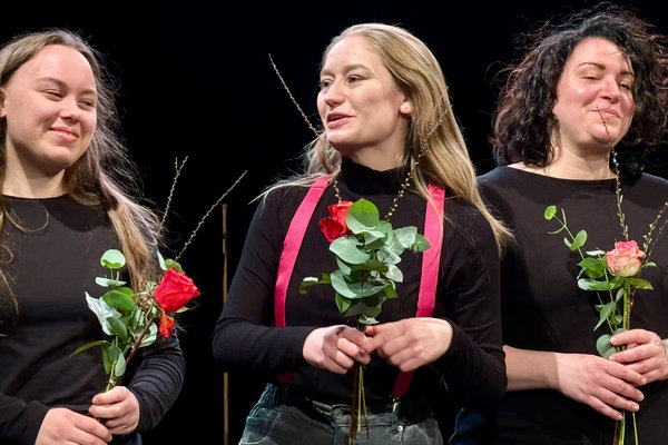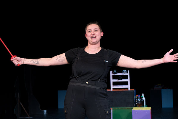 [Im gleichen Bühnenoutfit wie ihre Darstellerinnen freute sich Regisseurin Anna Franziska Pflitsch sichtlich über die gelungene Premiere.]
