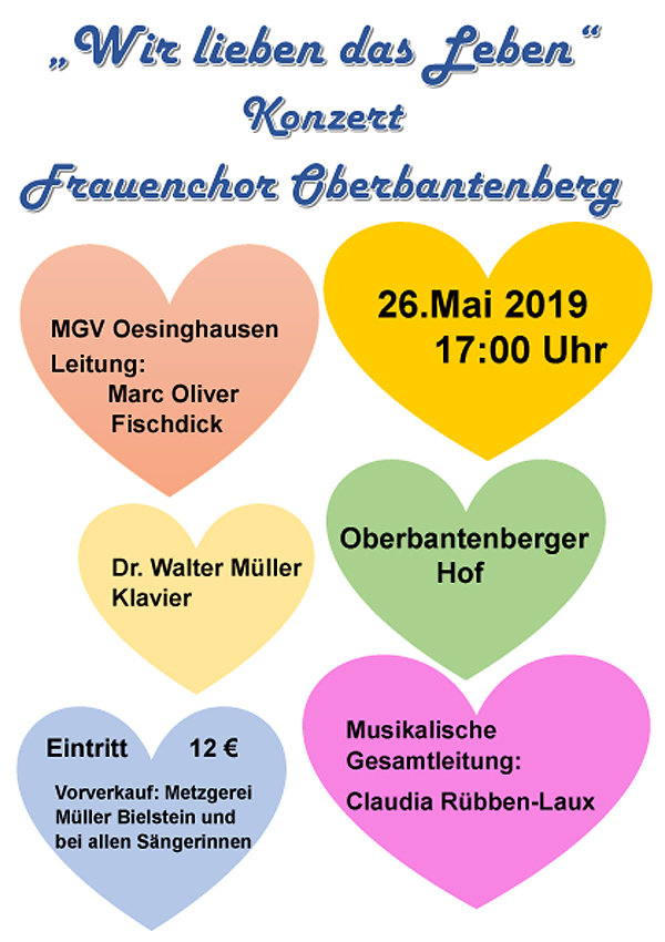 Der Frauenchor Oberbantenberg unter Leitung von Claudia Rübben-Laux lädt zu seinem Konzert unter dem Motto „Wir lieben das Leben“ am Sonntag, 26. Mai, um 17 Uhr in der Gaststätte Alt Athen - Oberbantenberger Hof ein. Die Sängerinnen wollen ihre Zuhörer in die Welt des Schlagers entführen, dabei werden sie von Dr. Walter Müller am Klavier begleitet. Weiterhin wird der Männergesangverein (MGV) Oesinghausen unter der Leitung von Marc Oliver Fischdick mitwirken. Der MGV Oesinghausen ist Leistungschor des Chorverbands NRW, der Frauenchor Oberbantenberg hat in 2018 das zehnte Mal den Titel Meisterchor verliehen bekommen.