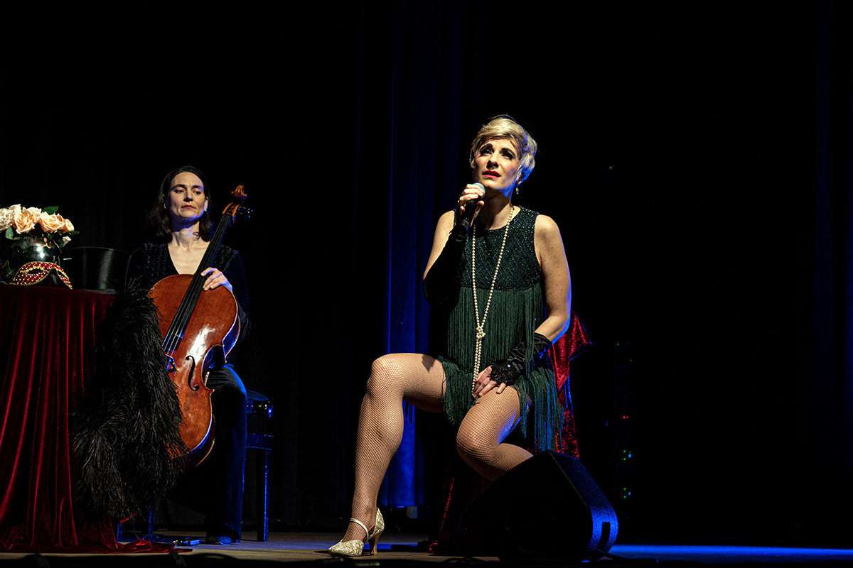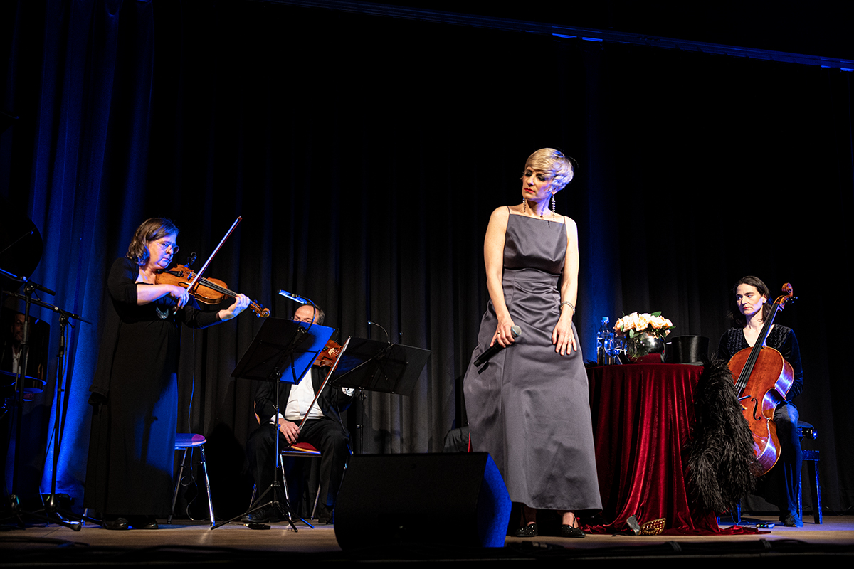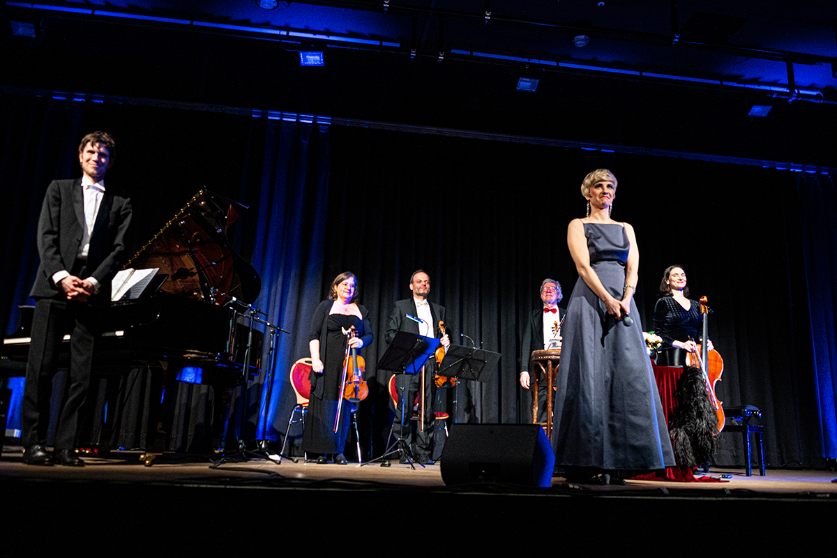 Vom grünen 1920er-Charleston-Kleid wechselte Haan nach der Pause zum noblen anthrazitfarbenen Abendkleid. Sehr gefühlvoll bot sie die teilweise melancholischen Lieder von Chava Albertstein, Sasha Argov und anderen auf Jiddisch, Hebräisch oder Deutsch dar. Begleitet von Benjamin Schaefer am Flügel und dem Diplomatischen Streichquartett mit Henriette Scheytt, Dr. Felix Klein, Ernst Herzog und Gabriella Strümpel. Beeindruckend auch „Lili Marleen“ in mehreren Sprachen – denn dieses Lied war die Hymne aller Soldaten, aller Länder, so die Sängerin.