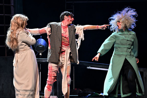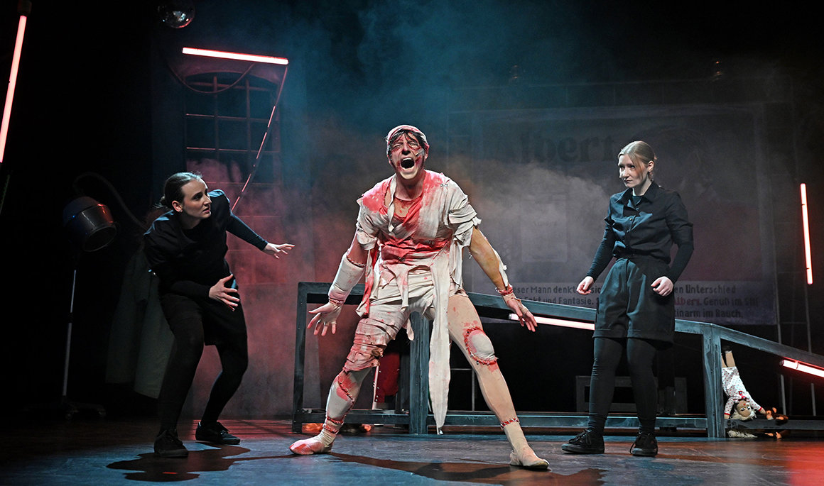 Aber sie erzählen nicht nur, es gibt auch tolle und anspruchsvolle Songs, komponiert von Martin Sundbom, die live vom Ensemble gesungen werden. So besingen sie auch den jungen Mann in blutverschmierten Mullbinden: das Monster, gespielt von Alexander, Maria Wolf. Der bleibt in der Rolle, die beiden Darstellerinnen wechseln in die Rollen von zwei Teenagerinnen und anschließend treten sie als Polizistinnen auf. Dreistimmig das Lied „Warum kann ich nicht aus dem Albtraum erwachen?“. Eine einsame, blinde alte Dame (Holtvoeth) nimmt das Monster mit nach Hause und bringt ihn zum Sprechen. Er will wissen: „Wer bin ich? Woher komme ich?“.