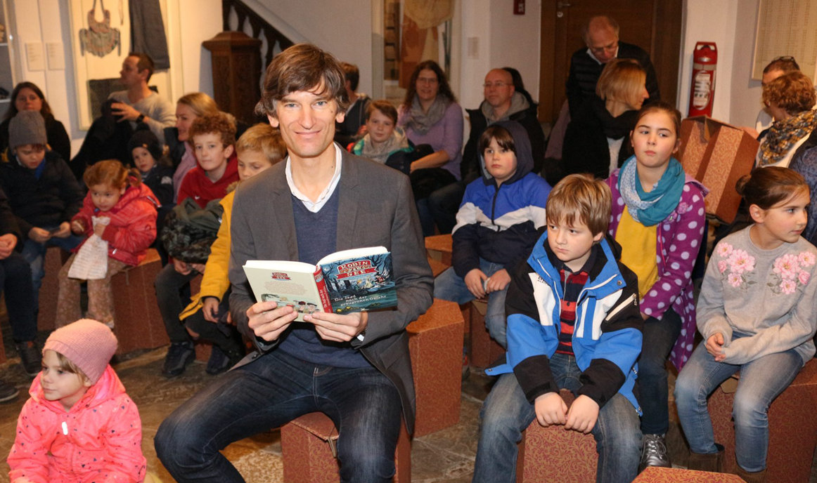 Gespannt saßen die Kinder auf kleinen Hockern und lauschten Vorleser Ulrich Fasshauer. Er las aus seinem Buch „Robin vom See - Die Jagd nach der graugrünen Gefahr“. Als in den Sommerferien Robin in dem badewannenwarmen See planscht, sieht er sich plötzlich einem Krokodil gegenüber. Die Aufregung ist groß: Ein Badeverbot wird verhängt und Fernsehteams belagern das Seehotel. Doch das Krokodil lässt sich nicht mehr blicken. Hat Robin sich vielleicht getäuscht? Als ihm fast niemand mehr glaubt, machen Kilian und er sich zu einer gefährlichen Krokodiljagd auf. Ein spannendes Abenteuer, dem die zuhörenden Kinder mit großer Aufmerksamkeit lauschten.