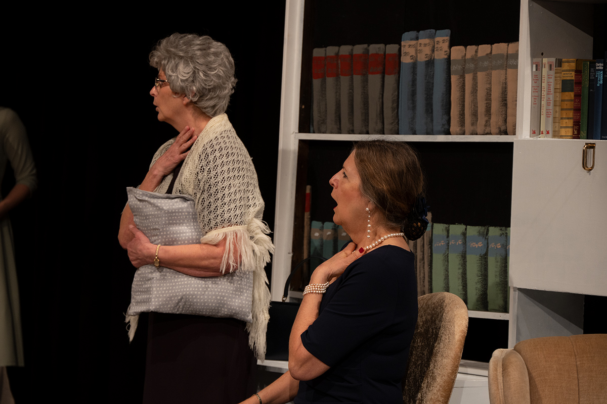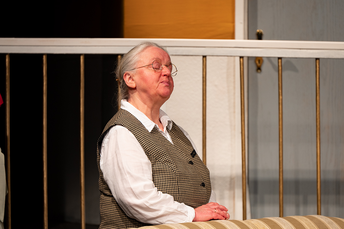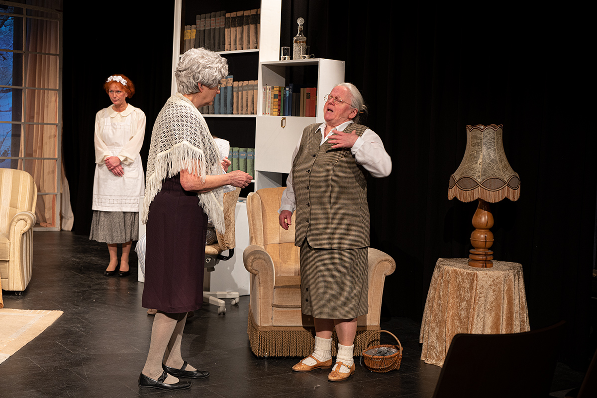 Almut Irmscher ist Gaby, die Herrin des Hauses: groß, elegant und von jener kühlen Beherrschtheit, der man jede Intrige zutraut. Sie behält statthaft die Contenance. Ihr Mann hat ihre Mamy und ihre Schwester Augustine aufgenommen - die beiden sind hin und hergerissen zwischen Dankbarkeit und ihrem Geiz. Jungfer Augustine legt zudem eine bewusst verletzende, zickige und rücksichtlose Art an den Tag – grandios von Bärbel Stinner dargestellt. Wunderbar ist Gaby Bülter in der Rolle der Mamy, die stets bemüht ist, zwischen ihren immerzu streitenden Töchtern zu vermitteln. Doch hinter ihrer großmütterlichen Fassade verbirgt sich eine scheinheilige Frau, die die Gastfreundlichkeit ihres Schwiegersohns schamlos ausnutzt und heimlich zur Flasche greift.
