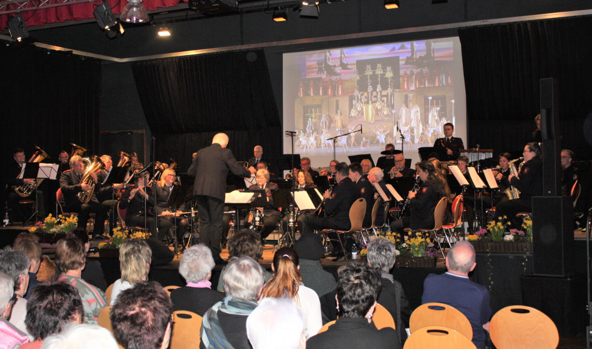 Zum Auftakt des Frühjahrskonzertes am Samstagabend im ausverkauften Krawinkelsaal hatte Orchesterleiter Heinz Rehring ganz bewusst den festlichen Triumphmarsch aus Guiseppe Verdis Oper Aida gewählt, denn „zur Eröffnung muss etwas Besonderes her“. Im Zusammenspiel mit seinen 35 glänzend aufgelegten Musikern setzte der musikalische Leiter des Musikzuges so den Ton für einen genussvollen Konzertabend, mit abwechslungsreicher Programmfolge, die dem Wunsch des Maestros folgend „alle abholen“ und „für jeden etwas bieten“ sollte. Der reichhaltige Hörgenuss wurde akzentuiert durch eine von Karl-Heinz Mourschinetz bedachtsam zusammengestellte Bildershow und der launigen Moderation, mit der Dirigent Rehring das Publikum während der zweieinhalbstündigen musikalischen Reise begleitete.