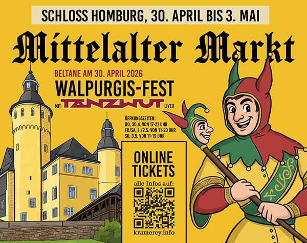 Mittelalterfans können sich freuen: Schloss Homburg ist vom 30. April bis zum 3. Mai wieder Schauplatz des ältesten Mittelaltermarktes in Westdeutschland. Über das verlängerte Wochenende am 1. Mai beleben erneut Ritter, Gaukler, Handwerker und Händler die Kulisse. Das historische Schlossgelände verwandelt sich in einen lebendigen Schauplatz längst vergangener Zeit, der Geschichte auf eindrucksvolle Weise lebendig werden lässt. Auch Robin Hood wird in Nümbrecht vorbeischauen. Das Spektakel verspricht viel Lehrreiches, Magie und historische Handwerkskunst für die ganze Familie.