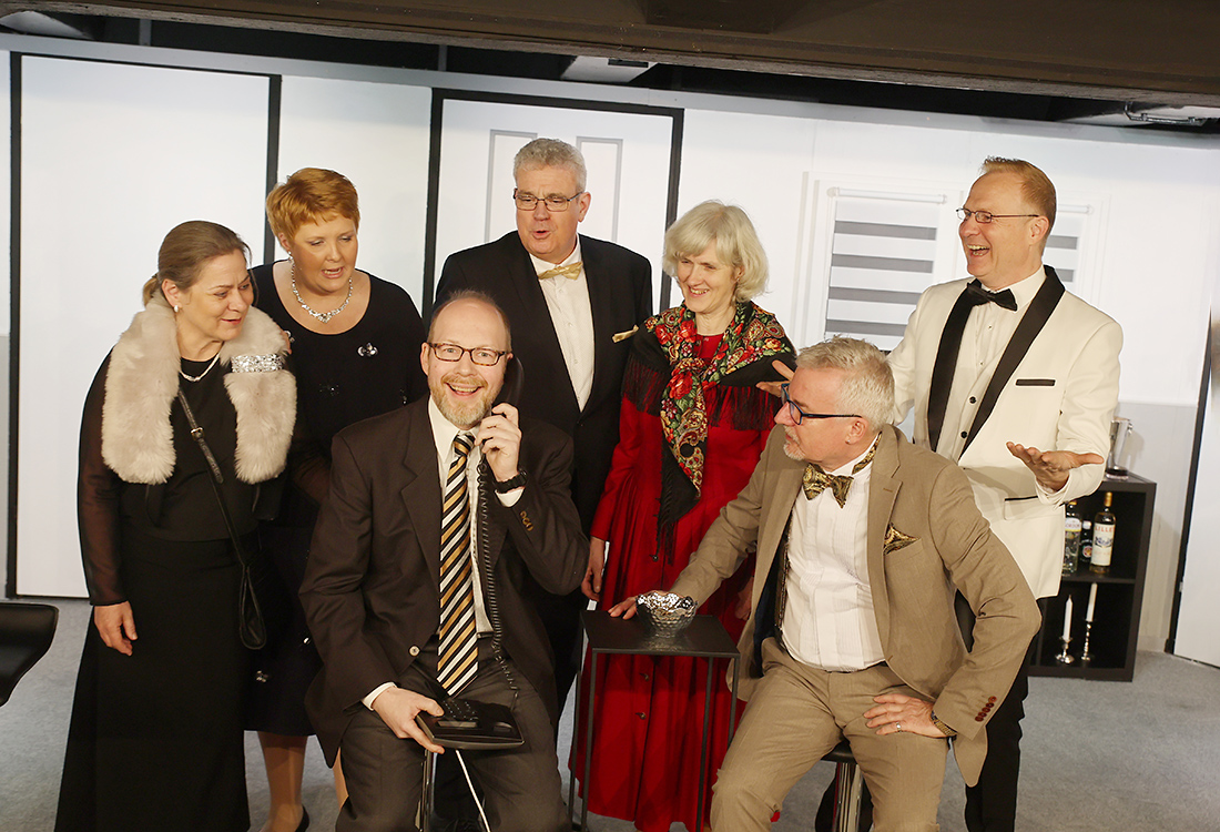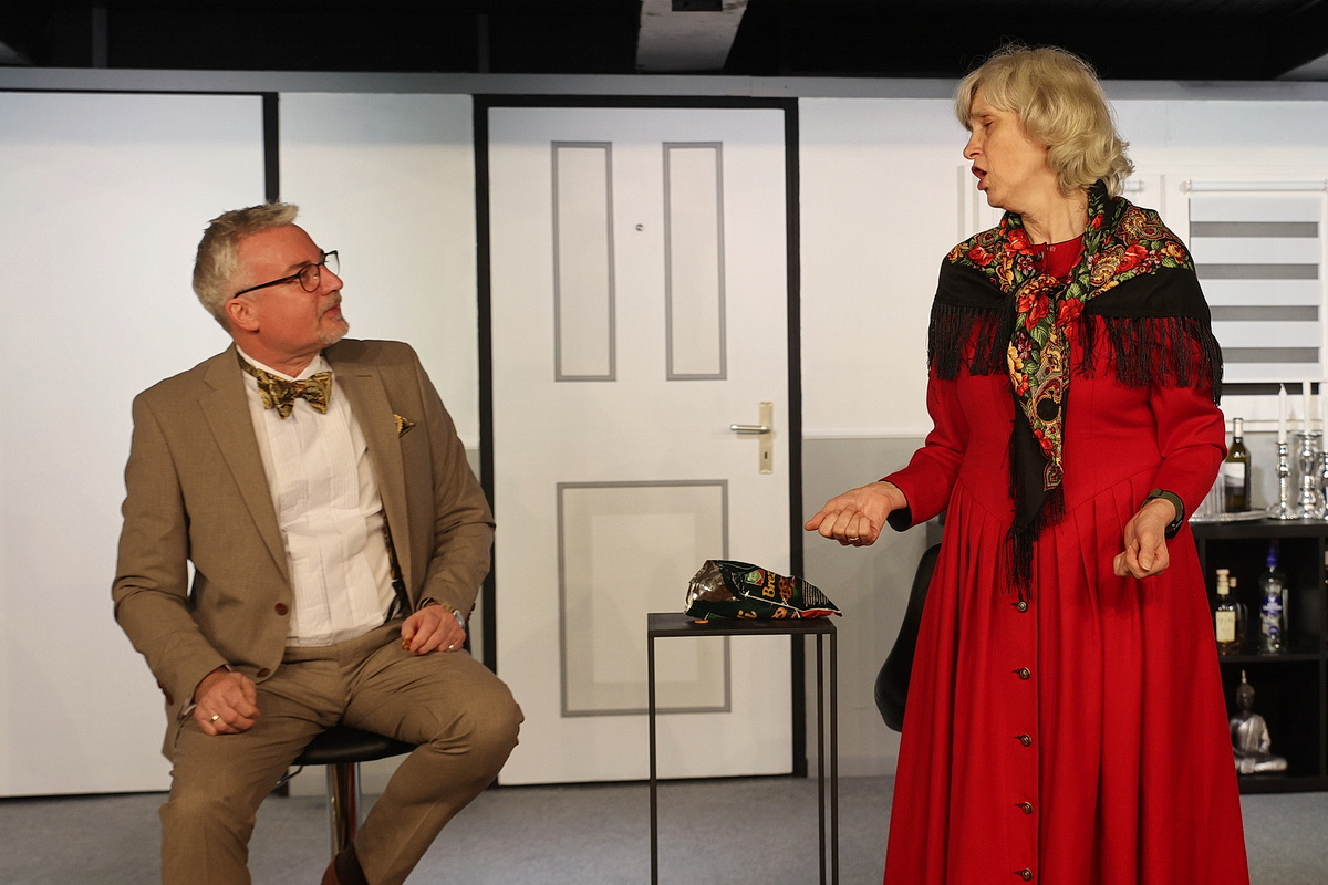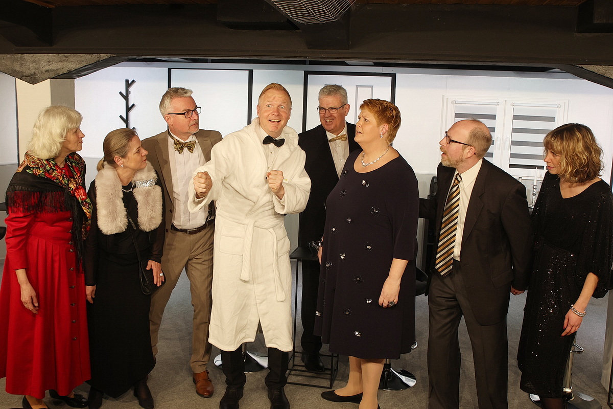 Zumindest der Anschein eines Festes soll gewahrt bleiben – inklusive des Abendessens, das die Gäste mangels Koch und Personal selbst zubereiten. Alles geht drunter und drüber, im Gespräch taucht immer wieder der Gastgeber auf, dessen Blut sich dann auch noch auf diversen Hemden wiederfindet, ohne dass jemand dem rätselhaften Geschehen auf die Spur kommt. Irgendwann tanzen die Gäste nicht nur ein geschicktes Ablenkungsmanöver, sondern auch den beiden eintreffenden Polizisten (Regina Förster und Marlo Potthoff) gehörig auf der Nase herum. Die beiden kommen eigentlich wegen eines Autounfalls, merken aber schnell, dass etwas nicht stimmt. Schließlich holt André Fritsche als Lenny in der vorgetäuschten Identität des Gastgebers zu einem fulminanten Erklär-Monolog aus…