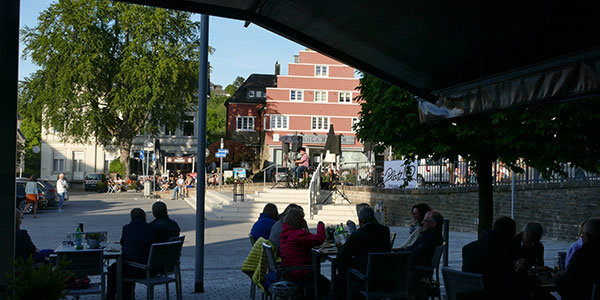 Wie sehr die Menschen handgemachte Livemusik während der Coronakrise vermisst haben, hat das Konzert des Kölner Musikers Mathias Nelles am Pfingstsonntag gezeigt. Mit der Veranstaltung wurde der frisch sanierte Marktplatz in der Stadtmitte sozusagen inoffiziell eingeweiht. Denn ein großes Fest darf momentan natürlich noch nicht stattfinden. Initiiert wurde der Auftritt von den Gastronomiebetrieben rund um den Platz in der Stadtmitte, die damit die Lockerungen aus dem Coronakorsett beim Schopfe packten und den Versuch unternahmen, wieder mehr Gäste an ihre Tische zu locken.