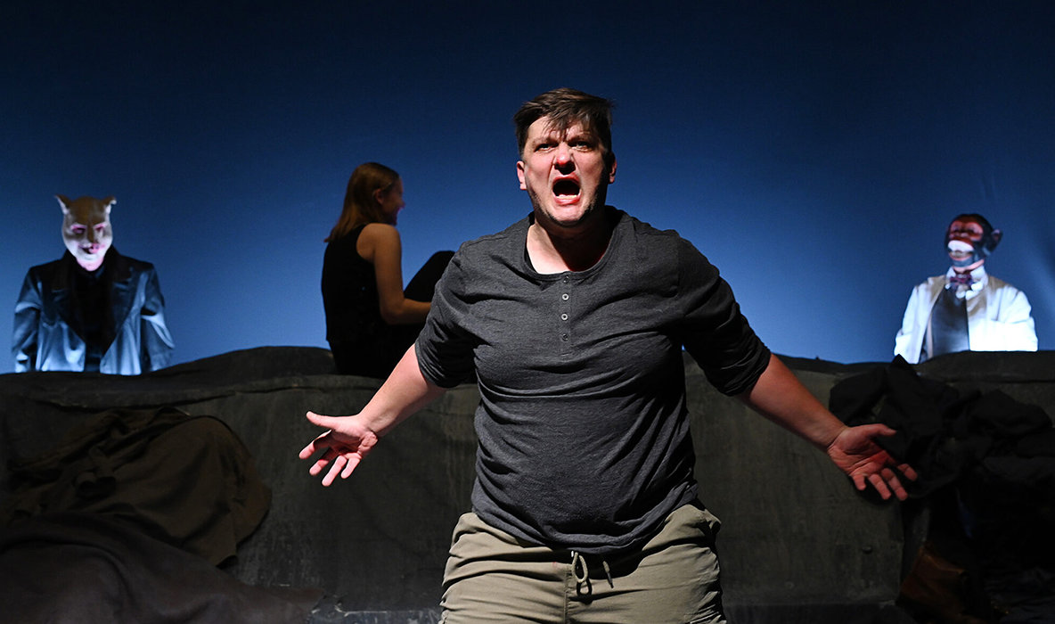 Sehr ausdrucksstark kommentiert Thyra Uhde (Rollenname: „Marktschreierin“), das Geschehen auf der Bühne. Sie hat etwas Diabolisches und teilweise fungiert sie als Spinnenfrau oder Femme fatale. Sie beobachtet gleich zu Beginn in der apokalyptisch wirkenden Inszenierung von Markus Kopf das Dreiergespann Woyzeck, Andres und Marie. Die soziale Verdammnis zeigt sich schnell. Woyzeck rasiert den Hauptmann (Burghard Braun im langen, schwarzen Ledermantel), um neben seinem Soldaten-Sold etwas dazu zu verdienen, muss er doch Marie und ihr gemeinsames Kind ernähren. Der Hauptmann rät ihm, dass er seine noch 30 Jahre Lebenszeit gut einteilen solle. Moral und Tugend müsse man sich leisten können, betont er und empfindet Woyzeck als „immer so verhetzt“. Woyzeck verteidigt sich, indem er ärmliche Lebensumstände und Sorgen als Grund für seine Natur angibt. Der Hauptmann reagiert mit nichtssagenden philosophischen Aussagen. Auch der Doktor (Guido Thurk) nimmt Woyzeck nicht ernst und nutzt ihn nur aus für seine Erbsendiät-Versuche.
