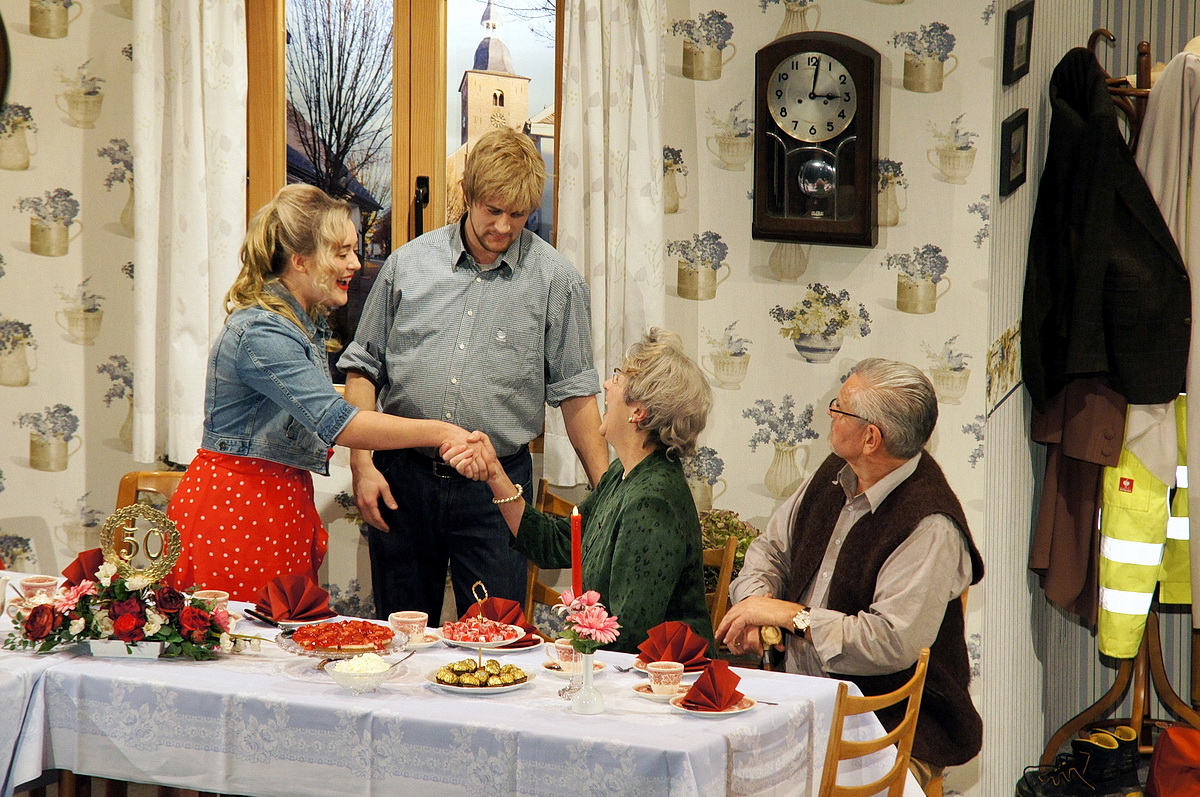 Gesagt, getan, das Wohnmobil ist ausgesucht und auch ein Käufer für den Hof steht in Aussicht. Die Frage ist nur: „Wie sagen sie es der Familie?“. Die Feier zu Margots Geburtstag scheint hierfür der geeignete Moment zu sein. Zum Familienfest wollen sie ihren Lieben endlich reinen Wein einschenken. Allerdings überschlagen sich an diesem Tag die Ereignisse. Schwiegertochter Reinhilde, grandios gespielt von Laura Peters, wittert Morgenluft und will den Schweinestall umbauen, um ein Kosmetikstudio zu eröffnen. Die Großeltern hingegen wollen einziehen, um sich so richtig verwöhnen zu lassen.