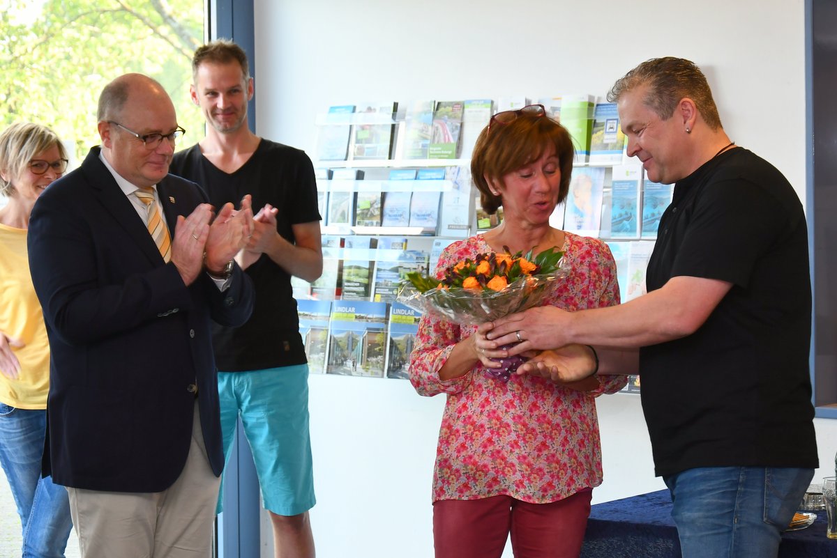 Mit einem Blumenstrauß bedankte sich Olli Müller bei Doris Kisters, der Fachleiterin des Bereichs LindlarKultur, die nicht nur mit kalten Getränke und Snacks für die Besucher gesorgt hatte, sondern bereits am Vorabend tatkräftig beim Aufbau der Ausstellung mitgeholfen hatte.