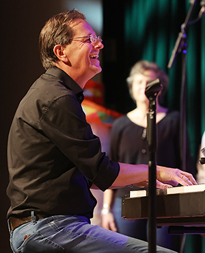 [Chorleiter Ralf Zimmermann ist auch Keyboarder in der „Voices Project Band“.]
