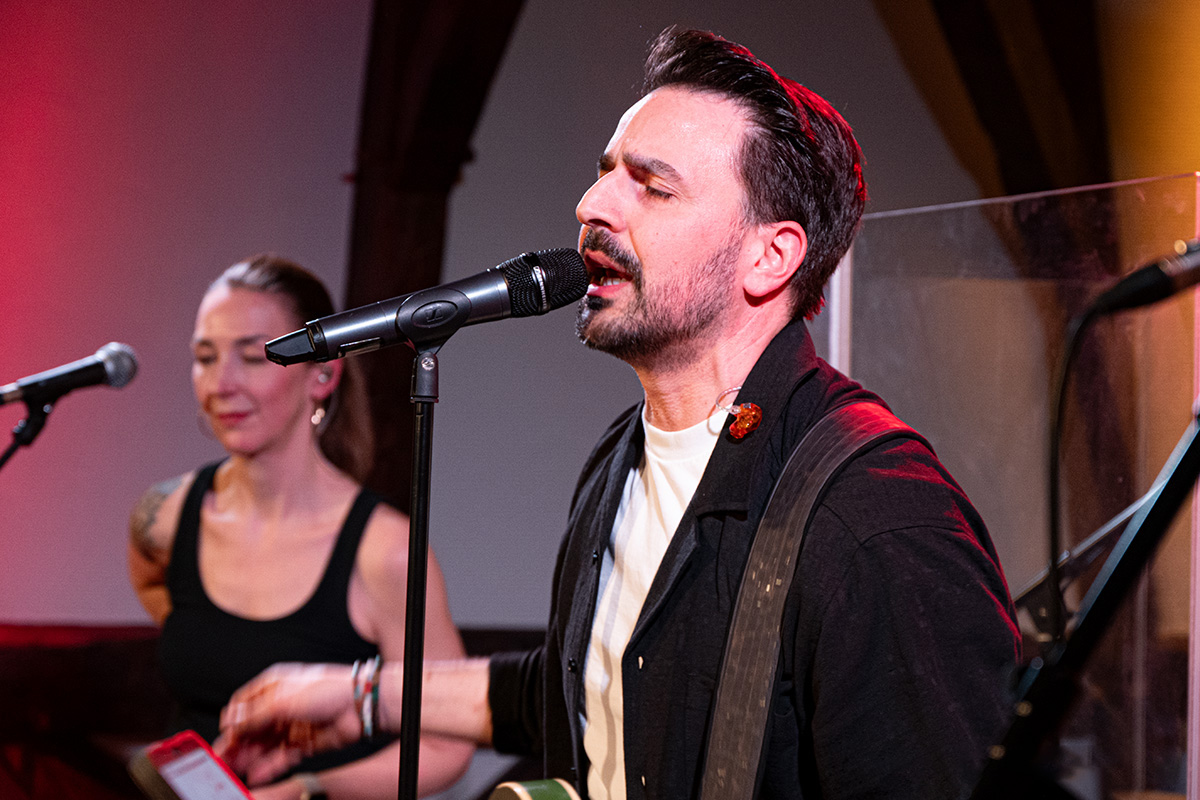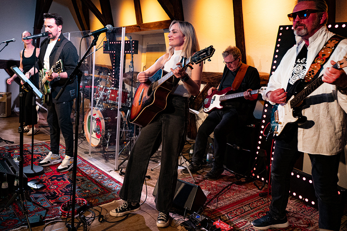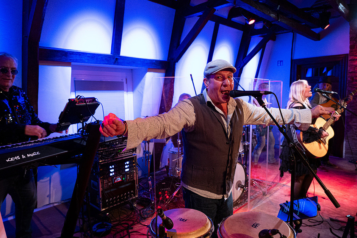 Für seine Schmusesongs ist der italienische Sänger Eros Ramazzotti bekannt. Seine Lieder – quer durch die Jahrzehnte – hatte die Band „Eros TC“ um den Sänger Toni Cardone zur Eröffnung der Tribute-Abende im Gepäck. Zu „Eros TC“ gehören außerdem Julia Cardone und Katrin Krüger-Willmeroth mit Backround-Gesang, Sven Krüger am Keyboard, Bassist Franz Martin Grund, Gitarrist Markus Stommel und Drummer Karsten Mannheim. Sie waren 2019 mit ihrem Elvis-Programm im Burghaus Bielstein und begeisterten damals schon das Publikum. Als waschechter Sizilianer und mit der typisch nasalen Stimmfarbe von Eros Ramazzotti war es für Toni Cardone eine Leichtigkeit, Stücke wie „Una Tempesta“ oder „Cose della vita“ zu singen. Zusammen mit der hervorragenden Band war ein toller Abend programmiert.