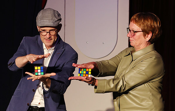 [Der Weltrekord im Lösen des Rubik's Cube liegt bei 3,13 Sekunden. Mit ein wenig Magie braucht Hartling etwas über eine Sekunde. "Ich werde langsam alt", kommentiert der Zauberer trocken.]