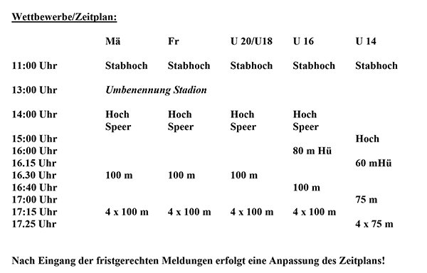 Das Startgeld für Jugendliche beträgt 4 Euro, Männer und Frauen zahlen 6 Euro. Meldungen für das Sportfest sind schriftlich bis zum 27. April an Hans-Jörg Schneider per Mail möglich.