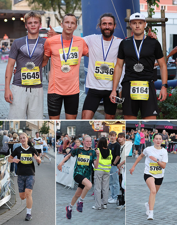 [Sieger beim Jedermannlauf über 4,5 Kilometer: Leonard Koch (4. Platz, oben v.li.), Nikita Zakhavchenko (2. Platz), Lukas Heinen (1. Platz) und Jacob Frey (3. Platz); Eva Jeschke (1. Platz, unten v.li.), Laura Klugmann (2. Platz) und Emma Hochstein (3. Platz).]