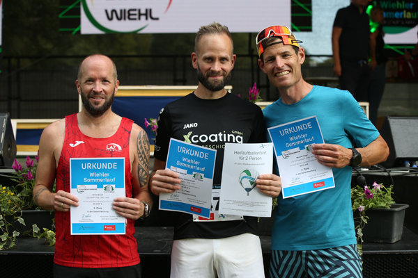 [Das Siegertreppchen des Hauptlaufs der Männer (v.li.): Der Zweitplatzierte Oliver Buxel, Sieger Michel-André Krüger und der Dritte Michael Hilger.]
