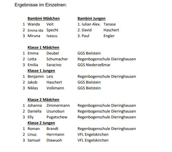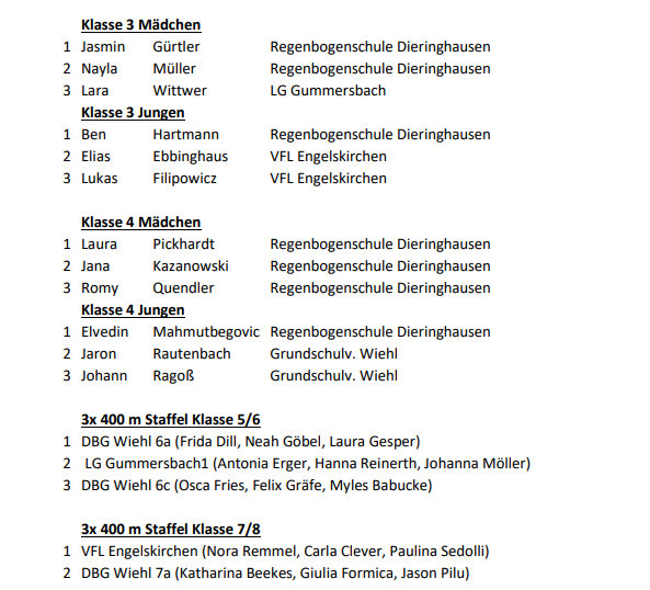 Über Eisgutscheine freuten sich die Klassen 2c, 1b und die 2a. Kinder der Grundschulen Bielstein, Ründeroth, Niederseßmar sowie vom GSV Wiehl, von der LG Gummersbach und des VfL Engelskirchen waren ebenfalls zahlreich vertreten. Bei den Staffeln der Klassen 5/6 standen nach spannendem Vor- und Finallauf das Team des Klasse 6a vom Dietrich-Bonhoeffer-Gymnasium Wiehl als Sieger fest, bei den Staffeln der Klassen 7/8 gewann das Team des VfL Engelskirchen.
