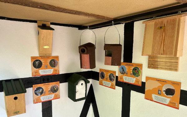 [Zu sehen gibt es auch die verschiedene Nisthilfen für die unterschiedlichen Vogelarten aus dem Bergischen Land.]