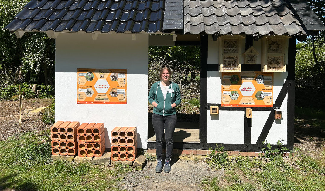 Bald soll es im LVR-Freilichtmuseum in Lindlar summen, denn heute Mittag stellte die wissenschaftliche Volontärin Carolin Gilgenbach ihre neue Outdoorausstellung „Biologische Vielfalt Bergischer Insekten und Brutvögel“ vor. Der Stand bietet Informationen zu den Ansprüchen und dem Gefährdungsstatus der Tiere. Zudem werden auch parasitäre Lebensformen innerhalb der Wildbienen und Wespen vorgestellt. Sie seien noch relativ unerforscht, aber sehr wichtig für die ökologische Vielfalt, denn die Tiere müssen sich an die Parasiten anpassen und weiterentwickeln, damit sie die Schädlinge bekämpfen können, erklärt Gilgenbach.