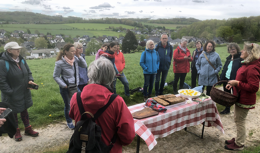19 Teilnehmer waren derweil bei der rund vierstündigen Kräuterführung mit Expertin Petra Burgmer aus Lindlar-Breun dabei. An den Pfaden im Süden des Gemeindegebiets entdeckte sie nützliche Wildkräuter und erklärte Wissenswertes über deren heilsame Wirkung. Besonders die „Bärlauch-Plantage“ hatte es den Wanderern angetan. Zum Abschluss genossen die Teilnehmer den von Petra Burgmer vorbereiteten Kräuterquark mit ihrem selbstgebackenen Brot aus Roggen- und Dinkelmehl. Ende Juni wollen Burgmer und Panske eine Sommer-Kräuterführung anbieten.