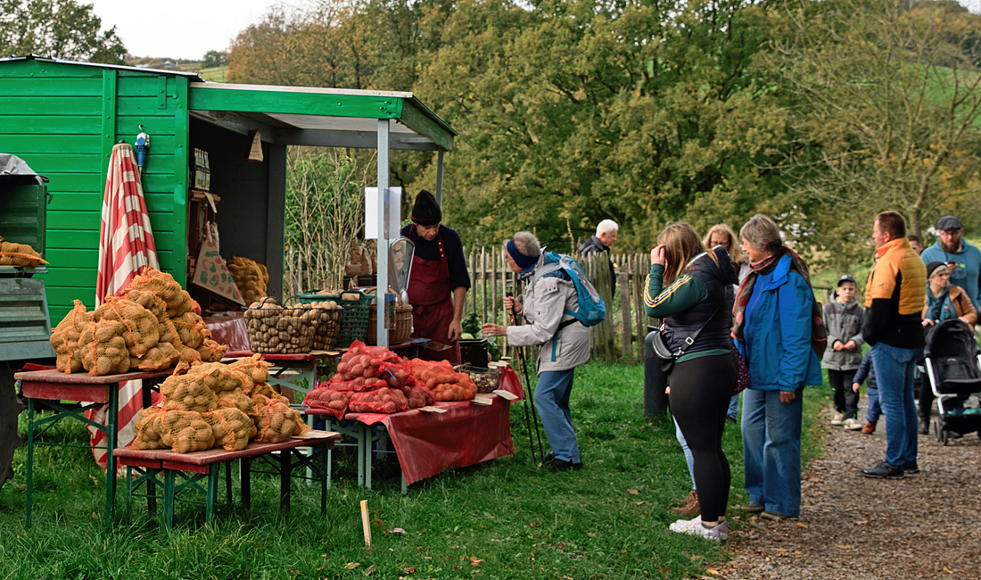 Kinder konnten aus der Knolle lustige Figuren, wie die Kartoffelkönigin und den Kartoffelkönig basteln. Und auch kulinarisch wurden die Gäste mit Reibekuchen und Apfelmuss oder herzhaften Rosmarinkartoffeln mit Kräuterquark verwöhnt. „Alles aus dem Bergischen Land“, hieß es aus der Küche. Die Bergische Greifvogelhilfe und die Rollende Waldschule präsentierten sich ebenfalls zum Kartoffelfest. Wer sich für Erntetechnik interessierte, konnte sich historische Geräte der Landwirtschaft anschauen und bei der Ackerarbeit mit Pferden zuschauen.