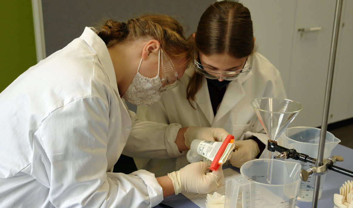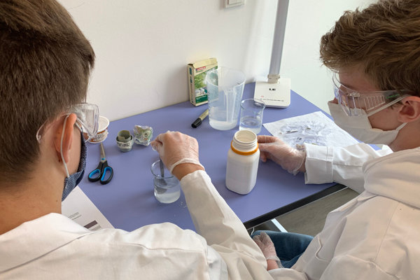 Anschließend führten die Schüler im MINT-LAB-Schülerlabor acht Experimente zu den Themen Kunststoffe und Mikroplastik durch. Ausgestattet mit Laborkittel, Schutzbrille und Handschuhen untersuchten die sie beispielsweise die Eigenschaften verschiedener Kunststoffe, beobachteten das Schwimmverhalten unterschiedlicher Kunststoffgegenstände, konnten Mikroplastik in Kosmetikprodukten nachweisen und sogar mit einem einfachen Strohhalm Kunststofffasern herstellen.