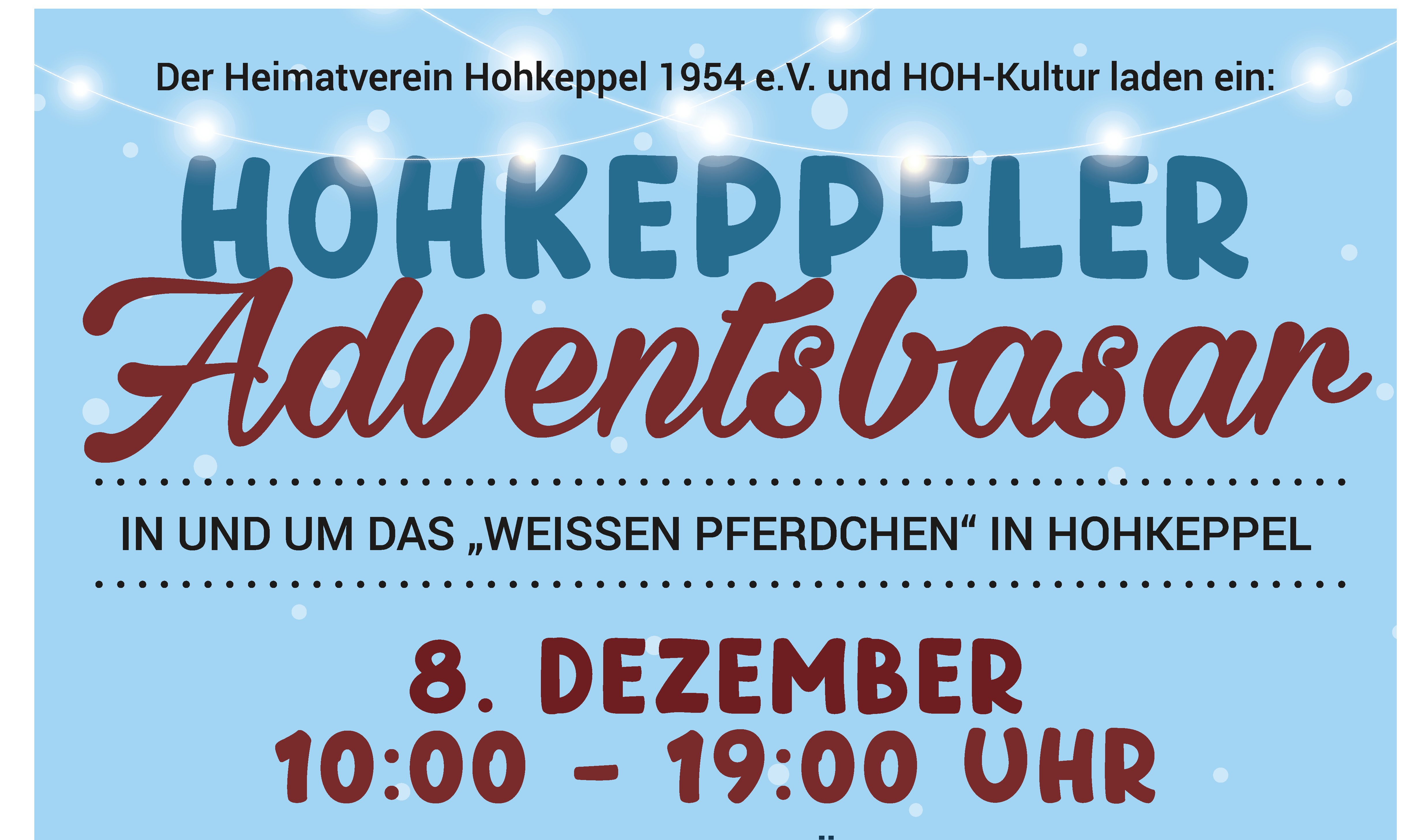 Von 10 bis 19 Uhr bieten in und neben dem denkmalgeschützten Fachwerkhaus zahlreiche Aussteller kunsthandwerkliche Artikel an, wie beispielsweise Keramikobjekte, Dekoartikel aus Holz, Weihnachtskarten, Schmuck, genähte und gestrickte Unikate, Liköre, Essige, Pesto und vieles mehr. Um 16:30 Uhr findet im Zelt neben dem „Weissen Pferdchen“ die vom Verein HOH-Kultur organisierte Nikolausfeier statt (Anmeldung der Kinder bis zum 21. November erforderlich). Das Team der Hohkeppeler Bücherei lädt alle Kinder von 15 bis 16 Uhr Uhr zu einer Vorlesestunde ein. Für das leibliche Wohl ist mit Waffeln, Weihnachtsplätzchen, Reibekuchen und Bratwürsten sowie mit Kaffee, Kakao und kalten Getränken gesorgt.